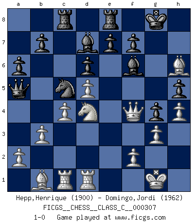 Last move : 1-0 2023 June 14 20:15:28 [Event "FICGS__CHESS__CLASS_C__000307"] [Site "FICGS"] [Date "2022.10.31"] [Round "1"] [White "Hepp,Henrique"] [Black "Domingo,Jordi"] [Result "1-0"] [WhiteElo "1900"] [BlackElo "1962"] 1.c4 g5 2.d4 h6 3.e4 Bg7 4.Nc3 d6 5.h4 g4 6.Nge2 Na6 7.Be3 c5 8.g3 Bd7 9.Bg2 cxd4 10.Nxd4 Rc8 11.Qe2 Qc7 12.b3 Qa5 13.Rc1 Be5 14.O-O Nf6 15.Nd5 Nxd5 16.exd5 h5 17.Rfd1 O-O 18.Bh6 Rfe8 19.Qe3 Bf6 20.Be4 Nc5 21.Bb1 a6 22.Bg5 Be5 23.Bh6 Bf6 24.Qf4 1-0 Follow this game move after move (download)Before the endgame, the Gods have placed the middle game. (Siegbert Tarrasch) Die starken Figuren des Gegners muss man abtauschen. (José Raúl Capablanca) Fischer es una tragedia del Ajedrez Americano a la par con Morphy y Pillsbury. (Mig Greengard) Dieu déplace le joueur, et celui-ci la pièce. Quel Dieu derrière Dieu commence donc la trame ? Arturo Perez-Reverte (prix de littérature policière 1993). What doesn't kill us makes us stronger. (Friedrich Nietzsche)
