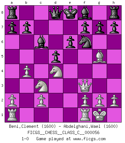 Last move : 1-0 2007 October 18 1:4:30 [Event "FICGS__CHESS__CLASS_C__000056"] [Site "FICGS"] [Date "2007.08.13"] [Round "1"] [White "Beni,Clement"] [Black "Abdelghani,Wael"] [Result "1-0"] [WhiteElo "1600"] [BlackElo "1600"] 1.e4 c5 2.b3 Nc6 3.Nf3 d6 4.Bb5 Bd7 5.Bxc6 Bxc6 6.O-O Bxe4 7.Nc3 Bc6 8.d4 cxd4 9.Nxd4 Nf6 10.Bg5 d5 11.Qf3 e6 12.b4 1-0 Sicilian defense Kingside Castling by player White (move 6) Player White won this chess game. Follow this game move after move (download)A thorough understanding of the typical mating continuations makes the most complicated sacrificial combinations leading up to them not only not difficult, but almost a matter of course. (Siegbert Tarrasch) Zu meiner Zeit war ein 20 jähriger ein junger Spieler, heute ist er ein Veteran. (Garry Kasparov) Un jugador que trata de regresar una movida en el Ajedrez es un futuro carterista. (Richard Fenton) On peut tirer plus d'utilité d'une partie perdue que de 100 parties gagnées. (Capablanca) The real danger is not that computers will begin to think like men, but that men will begin to think like computers. (Sydney J. Harris)