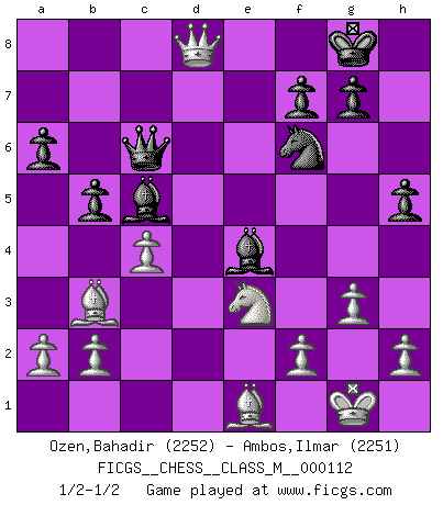 Last move : 1/2-1/2 2022 December 29 23:23:31 [Event "FICGS__CHESS__CLASS_M__000112"] [Site "FICGS"] [Date "2022.11.01"] [Round "1"] [White "Ozen,Bahadir"] [Black "Ambos,Ilmar"] [Result "1/2-1/2"] [WhiteElo "2252"] [BlackElo "2251"] 1.e4 e5 2.Nf3 Nc6 3.Bb5 a6 4.Ba4 Nf6 5.O-O Be7 6.Re1 b5 7.Bb3 O-O 8.c3 d5 9.exd5 Nxd5 10.Nxe5 Nxe5 11.Rxe5 c6 12.d3 Bd6 13.Re1 Bf5 14.Qf3 Re8 15.Rxe8+ Qxe8 16.Nd2 Qe1+ 17.Nf1 Bg6 18.g3 Re8 19.Bd1 Qe6 20.Bd2 Qd7 21.Bb3 Nf6 22.Re1 Rxe1 23.Bxe1 h5 24.d4 c5 25.Qd1 cxd4 26.Qxd4 Qc6 27.Ne3 Be4 28.c4 Bc5 29.Qd8+ 1/2-1/2 Follow this game move after move (download)I feel as if I were a piece in a game of Chess, when my opponent says of it: That piece cannot be moved. (Soren Kierkegaard) Je mehr ich von der FIDE weiss, um so weniger verstehe ich. (Alexander Kalifman) Los finales de Peón son del Ajedrez lo que el cesped es del Golf. (Cecil Purdy) À la honte des hommes, on sait que les lois du jeu sont les seules qui soient partout justes, claires, inviolables et exécutées. Pourquoi l'Indien qui a donné les règles du jeu d'échecs est-il obéi de bon gré dans toute la terre, et que les décrétales des papes, par exemple, sont aujourd'hui un objet d'horreur et de mépris ? C'est que l'inventeur des échecs combina tout avec justesse pour la satisfaction des joueurs, et que les papes, dans leurs décrétales, n'eurent en vue que leur seul avantage. L'Indien voulut exercer également l'esprit des hommes et leur donner du plaisir; les papes ont voulu abrutir l'esprit des hommes. Voltaire (Dictionnaire philosophique / Garnier 1967) If we don't succeed, we run the risk of failure. (George W. Bush)