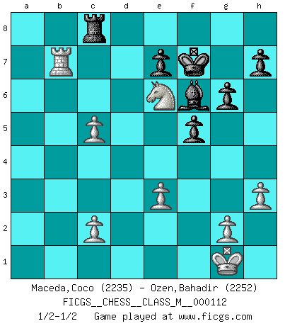 Last move : 1/2-1/2 2023 January 20 4:33:8 [Event "FICGS__CHESS__CLASS_M__000112"] [Site "FICGS"] [Date "2022.11.01"] [Round "1"] [White "Maceda,Coco"] [Black "Ozen,Bahadir"] [Result "1/2-1/2"] [WhiteElo "2235"] [BlackElo "2252"] 1.Nf3 d5 2.d4 Nf6 3.Bf4 c5 4.e3 Nc6 5.Nbd2 Qb6 6.dxc5 Qxb2 7.Rb1 Qc3 8.Bb5 g6 9.e4 a6 10.Bxc6+ bxc6 11.Be3 Bg4 12.Rb3 Bxf3 13.Qxf3 Qa1+ 14.Rb1 Qxa2 15.Qf4 Qa5 16.Rb8+ Rxb8 17.Qxb8+ Qd8 18.Qb7 Bg7 19.Qxc6+ Qd7 20.Qa8+ Qd8 21.Qxa6 O-O 22.Qd3 Qa8 23.O-O dxe4 24.Qc4 Ng4 25.h3 Ne5 26.Qxe4 Qxe4 27.Nxe4 Nc4 28.Rb1 f5 29.Ng5 Rc8 30.Ne6 Bf6 31.Rb7 Nxe3 32.fxe3 Kf7 1/2-1/2 Follow this game move after move (download)Bobby Fischer is the greatest Chess genius of all time ! (Alexander Kotov) Karpov ist ein Museumsstück. (Garry Kasparov) Desconfianza es la característica mas necesaria de un jugador de Ajedrez. (Siegbert Tarrasch) Les sacrifices démontrent seulement que quelqu'un a gaffé. (Savielly Tartacover) When the going gets tactical, the computers get going. (Hyatt)