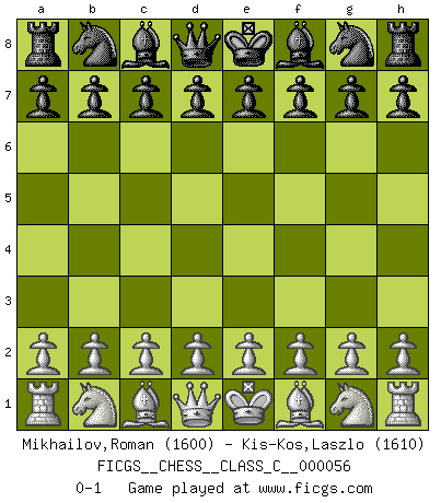Last move : 0-1 2007 September 22 9:22:41 [Event "FICGS__CHESS__CLASS_C__000056"] [Site "FICGS"] [Date "2007.08.13"] [Round "1"] [White "Mikhailov,Roman"] [Black "Kis-Kos,Laszlo"] [Result "0-1"] [WhiteElo "1600"] [BlackElo "1610"] 0-1 This chess game has been lost on time (started : 2007.08.13 4:30:52) Player Black won this chess game. Follow this game move after move (download)Many have become Chess Masters, no one has become the Master of Chess. (Siegbert Tarrasch) Pläne sind die Träume des Verständigen. (Ernst Freiherr von Feuchtersleben) El Ajedrez hace al hombre ser mas sabio y ver mas claro. (Vladimir Putin) Les échecs c'est le défi de l'alpiniste, toujours plus haut, prêt à tout pour monter à l'assaut du Roi ennemi. Les échecs, c'est de la musique en mouvement, un ballet majestueux pour les yeux. C'est de la poésie composée par les fantômes du passé qui au même titre que Rimbaud ou Verlaine méritent notre admiration. Les échecs, c'est de la peinture ou le moindre mouvement modifie le tableau pour en faire un Picasso ou un Van Gogh. Les échecs, c'est tout et rien, c'est la vie et la mort. Jjulie33 sur le forum de France-Echecs. The existence of forgetting has never been proved: We only know that some things don't come to mind when we want them. (Friedrich Nietzsche)