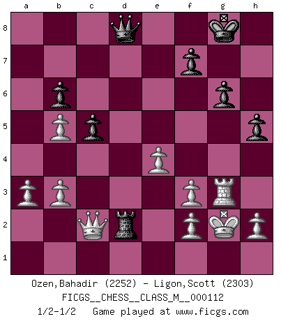 Last move : 1/2-1/2 2022 December 14 16:32:19 [Event "FICGS__CHESS__CLASS_M__000112"] [Site "FICGS"] [Date "2022.11.01"] [Round "1"] [White "Ozen,Bahadir"] [Black "Ligon,Scott"] [Result "1/2-1/2"] [WhiteElo "2252"] [BlackElo "2303"] 1.d4 d5 2.c4 e5 3.dxe5 d4 4.Nf3 Nc6 5.a3 g6 6.Bg5 Be7 7.Bxe7 Qxe7 8.Nxd4 Nxe5 9.e3 Nf6 10.Nc3 O-O 11.Be2 Rd8 12.Qb3 Bg4 13.O-O c5 14.Nf3 Bxf3 15.Bxf3 Nxf3+ 16.gxf3 Nd7 17.Nd5 Qg5+ 18.Kh1 b5 19.Rg1 Qh4 20.cxb5 Nb6 21.Nxb6 axb6 22.Qc2 Rd5 23.Rad1 Rad8 24.Rxd5 Rxd5 25.e4 Rd4 26.Rg3 Qd8 27.Kg2 h5 28.b3 Rd2 29.Qc3 Rd3 30.Qc4 Rd4 31.Qc2 Rd2 1/2-1/2 Follow this game move after move (download)I know people who have all the will in the world, but still can't play good Chess. (Bobby Fischer) Ich war zu klein für die Schach-Schülermannschaft! (Woody Allen) No soy una persona materialista y por eso, no resiento la falta o pérdida del dinero. La ausencia de cosas mundanas carece de importancia. Ya que el Ajedrez es una forma en la que puedo ser tan materialista como yo desee sin tener la necesidad de vender mi alma. (Jamie Walter Adams) Vous savez, camarade Pachman, je n'éprouve pas de plaisir à être ministre, je jouerais plutôt aux échecs comme vous, ou alors ferais une révolution au Venezuela. (Che Guevara à Ludek Pachman, 'Checkmate in Prague', 1975) Ah, the Socrating method. The best way we have of teaching everything-apart from juggling chainsaws. (Gregory House, House M.D.)