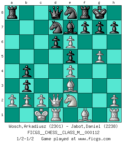 Last move : 1/2-1/2 2023 May 14 19:57:39 [Event "FICGS__CHESS__CLASS_M__000112"] [Site "FICGS"] [Date "2022.11.01"] [Round "1"] [White "Wosch,Arkadiusz"] [Black "Jabot,Daniel"] [Result "1/2-1/2"] [WhiteElo "2301"] [BlackElo "2238"] 1.e4 c5 2.Nf3 d6 3.d4 cxd4 4.Nxd4 Nf6 5.Nc3 a6 6.Be3 e5 7.Nb3 Be6 8.f3 Be7 9.Qd2 O-O 10.O-O-O Nbd7 11.g4 b5 12.g5 b4 13.Ne2 Ne8 14.f4 a5 15.f5 a4 16.fxe6 axb3 1/2-1/2 Follow this game move after move (download)After a bad opening, there is hope for the middle game. After a bad middle game, there is hope for the endgame. But once you are in the endgame, the moment of truth has arrived. (Edmar Mednis) Die westlichen Werte sind eine Sprache, welche die Putin-Administration nicht versteht. (Garry Kasparov) Sin errores no puede haber brillantez. (Emanuel Lasker) Les erreurs sont comme les malheurs, elles n'arrivent jamais seules. (Siegbert Tarrasch) Political correctness is subjecting us to gross incompetence. (Johann Piek)