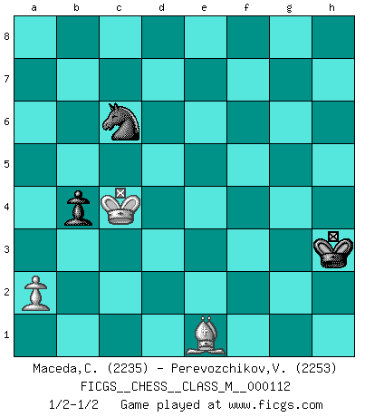Last move : 1/2-1/2 2023 February 18 12:16:20 [Event "FICGS__CHESS__CLASS_M__000112"] [Site "FICGS"] [Date "2022.11.01"] [Round "1"] [White "Maceda,Coco"] [Black "Perevozchikov,Vjacheslav"] [Result "1/2-1/2"] [WhiteElo "2235"] [BlackElo "2253"] 1.Nf3 Nf6 2.d4 g6 3.c4 Bg7 4.Nc3 d5 5.Qb3 dxc4 6.Qxc4 O-O 7.e4 Nc6 8.Be2 e5 9.d5 Nd4 10.Nxd4 exd4 11.Qxd4 c6 12.Qc4 b5 13.Qxc6 Bd7 14.Qd6 Re8 15.Bd3 a5 16.f3 Nh5 17.Be3 f5 18.Rd1 Be5 19.Qb6 Bc7 20.Qd4 Be5 21.Qc5 b4 22.Ne2 fxe4 23.fxe4 Nf6 24.d6 Rc8 25.Qb6 Qxb6 26.Bxb6 Bxb2 27.O-O Nxe4 28.Bc7 Nc5 29.Bc4+ Kh8 30.Nf4 Re4 31.Nd5 Rxc4 32.Nb6 Rd4 33.Nxc8 Bxc8 34.Rb1 Ba6 35.Rxb2 Bxf1 36.Kxf1 Nb7 37.Ke2 Kg7 38.Rd2 Rxd2+ 39.Kxd2 Kf6 40.d7 Ke7 41.d8Q+ Nxd8 42.Bxa5 Nc6 43.Bb6 Kd6 44.Kc2 Kd5 45.Kb3 g5 46.Be3 g4 47.Bb6 h5 48.Be3 h4 49.h3 Ke4 50.Bg5 gxh3 51.gxh3 Kf3 52.Bxh4 Kg2 53.Be1 Kxh3 54.Kc4 1/2-1/2 Follow this game move after move (download)Chess is mental torture. (Garry Kasparov) Mein Name ist Rustam Kamsky. Sie haben meinen Sohn belästigt. Bereiten Sie sich aufs Sterben vor. (Rustam Kamsky) Me gusta decir que Bobby Fischer fue el mejor jugador que jamás haya existido. Pero lo que hizo de Fischer un genio, fue su habilidad de mezclar una frescura y pragmatismo Americano con ideas Rusas acerca de la estrategia. (Bruce Pandolfini) Des points faibles ou des trous dans la position de l'adversaire doivent être occupés par des pièces et non pas par des pions. (Siegbert Tarrasch) Horse racing is animated roulette. (Roger Kahn)