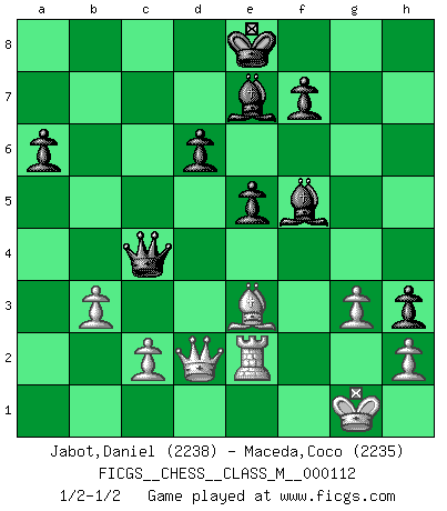 Last move : 1/2-1/2 2023 May 20 5:15:6 [Event "FICGS__CHESS__CLASS_M__000112"] [Site "FICGS"] [Date "2022.11.01"] [Round "1"] [White "Jabot,Daniel"] [Black "Maceda,Coco"] [Result "1/2-1/2"] [WhiteElo "2238"] [BlackElo "2235"] 1.e4 c5 2.Nf3 d6 3.d4 cxd4 4.Nxd4 Nf6 5.Nc3 a6 6.Bg5 e6 7.f4 h6 8.Bh4 Qb6 9.a3 Nc6 10.Bf2 Qc7 11.Bd3 Be7 12.O-O b5 13.Nxc6 Qxc6 14.Qf3 Bb7 15.Be3 Rd8 16.Qg3 h5 17.Rae1 h4 18.Qh3 g6 19.Rd1 Qc7 20.Rde1 Rh7 21.Bd4 e5 22.Be3 Bc8 23.Qf3 h3 24.g3 Qb7 25.Be2 Bg4 26.Qf2 Rc8 27.Bf3 Rc4 28.Bh1 Be6 29.Qd2 b4 30.axb4 Qxb4 31.f5 gxf5 32.exf5 Bd7 33.Re2 Rh5 34.Nd5 Nxd5 35.Bxd5 Rxf5 36.Rxf5 Bxf5 37.Bxc4 Qxc4 38.b3 1/2-1/2 Follow this game move after move (download)Chess is a cold bath for the mind. (Sir John Simon) Rubinstein ist ein Turmendspiel, welches die Götter vor tausenden von Jahren begannen. (Savielly Grigorievitsch Tartakower) Sin errores no puede haber brillantez. (Emanuel Lasker) Il vaut toujours mieux jouer un plan faux de façon logique que de n'avoir pas de plan du tout. (Victor Kortchnoï) There are 10 types of people in this world: those who understand binary and those who don't. (Anonymous)