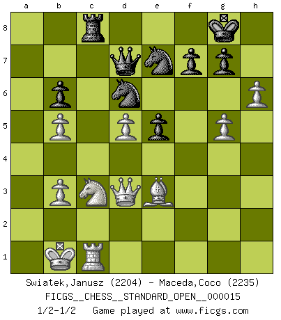 Last move : 1/2-1/2 2023 January 29 21:43:34 [Event "FICGS__CHESS__STANDARD_OPEN__000015"] [Site "FICGS"] [Date "2022.11.01"] [Round "1"] [White "Swiatek,Janusz"] [Black "Maceda,Coco"] [Result "1/2-1/2"] [WhiteElo "2204"] [BlackElo "2235"] 1.e4 c5 2.Nf3 d6 3.d4 cxd4 4.Nxd4 Nf6 5.Nc3 a6 6.h3 Nbd7 7.g4 h6 8.Bg2 e6 9.f4 Qb6 10.b3 Be7 11.Be3 Qc7 12.Qd2 Nf8 13.O-O-O Bd7 14.Kb1 Ng6 15.Rhg1 Rc8 16.Nce2 a5 17.a4 O-O 18.g5 hxg5 19.fxg5 Ne8 20.Rc1 d5 21.exd5 e5 22.Nb5 Bxb5 23.axb5 b6 24.h4 Ba3 25.Bh3 Nd6 26.h5 Ne7 27.Bxc8 Rxc8 28.Qd3 Bxc1 29.Rxc1 a4 30.h6 Qd7 31.Nc3 axb3 32.cxb3 1/2-1/2 Follow this game move after move (download)When you absolutely don't know what to do anymore, it is time to panic. (John van der Wiel) Versuche, dich von der Sklaverei der Eröffnungsvarianten zu befreien. Stattdessen soll man gewisse Typenpositionen erlernen, die man eingehend analysiert. (Aaron Nimzowitsch) En el Ajedrez, tal como en la vida, las bendiciones de hoy pueden ser el veneno del mañana. (Assaic) Des combinaisons [dans le jeu d'échecs] pareilles à des mélodies. Je crois entendre pour ainsi dire la musique des coups... (Vladimir Nabokov) Hold em is to stud what chess is to checkers. (Johnny Moss)