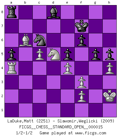 Last move : 1/2-1/2 2023 January 20 21:42:23 [Event "FICGS__CHESS__STANDARD_OPEN__000015"] [Site "FICGS"] [Date "2022.11.01"] [Round "2"] [White "LaDuke,Matt"] [Black "Slawomir,Weglicki"] [Result "1/2-1/2"] [WhiteElo "2251"] [BlackElo "2009"] 1.e4 e5 2.Nf3 Nc6 3.Bb5 a6 4.Ba4 Nf6 5.Nc3 Be7 6.d3 d6 7.a3 O-O 8.h3 Be6 9.O-O h6 10.Bxc6 bxc6 11.Re1 c5 12.b4 cxb4 13.axb4 c6 14.Bd2 Qc7 15.d4 Rfe8 16.Qe2 Qb7 17.Qd3 Bf8 18.Reb1 Nd7 19.Na4 Qb5 20.dxe5 dxe5 21.Nc5 Qxd3 22.Nxd3 Bc4 23.Nb2 Be2 24.Re1 Bxf3 25.gxf3 c5 26.bxc5 Bxc5 27.Nd3 Rec8 28.Ra2 f6 29.Rb1 Bd6 30.Kg2 Rc6 31.Be3 Nf8 32.Rb6 Rxb6 33.Bxb6 Kf7 34.c4 Ne6 35.Kg3 Be7 36.h4 h5 37.Ra5 Nd8 38.c5 Nc6 39.Ra4 g5 40.Nb2 a5 41.Nc4 Ke6 42.Ne3 Bd8 43.Kg2 Be7 44.Kh2 Bd8 45.Nd5 Kf7 1/2-1/2 Follow this game move after move (download)Chess is a fairy tale of 1001 blunders. (Savielly Tartakower) Wenn Du einsam bist, wenn Du Dich in der Welt wie ein Fremder fühlst, spiele Schach. Das wird Deinen Geist erheben und Dein Ratgeber im Kampf sein. (Aristoteles) El Ajedrez no es como la vida... ¡tiene reglas!. (Mark Pasternak) La conception d'un plan est le processus par lequel un joueur exploite les avantages de sa position tout en s'efforçant d'en réduire au minimum les inconvénients. Afin de garantir le succès, un plan doit toujours se fonder sur un diagnostic objectif des particularités d'une position. La conception d'un plan est d'autant plus difficile que la position est équilibrée, et grandement facilitée lorsqu'il n'existe qu'un seul plan susceptible de répondre aux exigences de la position. (Harry Golombek) Hello Thibault, if I have had a plan (and I had one, I hope), I have forgotten it during the last week... - Hello Heinz-Georg. What do you mean a plan ? (Anonymous players, during a Big Chess game)