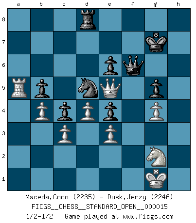 Last move : 1/2-1/2 2023 February 26 19:35:37 [Event "FICGS__CHESS__STANDARD_OPEN__000015"] [Site "FICGS"] [Date "2022.11.01"] [Round "1"] [White "Maceda,Coco"] [Black "Dusk,Jerzy"] [Result "1/2-1/2"] [WhiteElo "2235"] [BlackElo "2246"] 1.Nf3 d5 2.d4 Nf6 3.Bf4 c5 4.e3 Nc6 5.Nbd2 Bg4 6.c3 e6 7.Qb3 Qc8 8.h3 Bh5 9.Be2 h6 10.Qa4 a6 11.Bd3 Bxf3 12.Nxf3 c4 13.Bb1 Qd7 14.Qd1 Bd6 15.O-O Rd8 16.b4 Ne4 17.Qe1 f5 18.a4 O-O 19.Ra2 b5 20.Bxd6 Qxd6 21.Nh4 Kh7 22.g4 g5 23.Ng2 fxg4 24.hxg4 Kg7 25.f4 Ne7 26.axb5 axb5 27.Ra5 Qd7 28.Bxe4 dxe4 29.Qg3 Nd5 30.fxg5 Rxf1+ 31.Kxf1 Qf7+ 32.Kg1 hxg5 33.Qe5+ Qf6 1/2-1/2 Follow this game move after move (download)Tactics flow from a superior position. (Bobby Fischer) Irgendwie scheint mir sonntags früh um 9 Uhr der Killerinstinkt verloren gegangen zu sein. (Alexej Shirov) Cuando tengo las piezas blancas, yo gano porque soy blanco; Cuando tengo las piezas negras, yo gano porque soy Bogolyubov. (Bogolyubov) Il vaut toujours mieux jouer un plan faux de façon logique que de n'avoir pas de plan du tout. (Victor Kortchnoï) There are two major products that came out of Berkeley: LSD and UNIX. We do not believe this is to be a coincidence. (Jeremy S. Anderson)