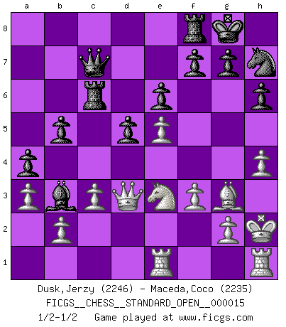 Last move : 1/2-1/2 2023 February 26 19:35:49 [Event "FICGS__CHESS__STANDARD_OPEN__000015"] [Site "FICGS"] [Date "2022.11.01"] [Round "2"] [White "Dusk,Jerzy"] [Black "Maceda,Coco"] [Result "1/2-1/2"] [WhiteElo "2246"] [BlackElo "2235"] 1.e4 c5 2.Nf3 d6 3.c3 Nf6 4.h3 Nc6 5.Bd3 d5 6.e5 Nd7 7.Bb5 Qb6 8.Na3 e6 9.d3 a6 10.Bxc6 Qxc6 11.Nc2 b6 12.O-O h6 13.Bf4 Be7 14.Ne3 a5 15.d4 Nf8 16.Bg3 Ba6 17.Re1 Rc8 18.h4 Qd7 19.a3 Nh7 20.Qd2 Qd8 21.Rad1 O-O 22.Qc2 Rc7 23.Kh2 Qe8 24.Qd2 Rc8 25.Ng4 Bc4 26.Kg1 Bb3 27.Rc1 Qd8 28.Kh2 a4 29.Rh1 b5 30.dxc5 Bxc5 31.Nd4 Qa5 32.f3 Bxd4 33.Qxd4 Rc4 34.Qd3 Qc7 35.Ne3 Rc6 36.Rce1 1/2-1/2 Follow this game move after move (download)No price is too great for the scalp of the enemy King. (Koblentz) Ein Schachspiel besteht aus drei Phasen: Die erste, wenn du hofftst den Vorteil zu haben, die zweite, wenn du glaubst einen Vorteil zu haben, und die dritte.... wenn du weißt Du wirst verlieren. (Savielly Grigorievitsch Tartakower) El Ajedrez es como la guerra en un tablero. (Bobby Fischer) 'L'échange des dames est un coup dur pour les deux adversaires...' Un journaliste lors d'une partie du match Spassky-Fischer Be who you are, and say what you feel because those who mind don't matter, and those who matter don't mind. (Dr Seuss)