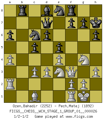 Last move : 1/2-1/2 2023 January 16 21:34:39 [Event "FICGS__CHESS__WCH_STAGE_1_GROUP_01__000026"] [Site "FICGS"] [Date "2022.11.02"] [Round "1"] [White "Ozen,Bahadir"] [Black "Pech,Matej"] [Result "1/2-1/2"] [WhiteElo "2252"] [BlackElo "1892"] 1.e4 e5 2.Nf3 Nc6 3.Bb5 a6 4.Ba4 Nf6 5.O-O Be7 6.Re1 b5 7.Bb3 O-O 8.a4 Bb7 9.d3 d6 10.Nbd2 Na5 11.Ba2 c5 12.Nf1 bxa4 13.Ne3 Bc6 14.Nh4 Bd7 15.Nhf5 Rb8 16.Rf1 h6 17.h3 Nc6 18.c3 Kh7 19.b3 Be6 20.bxa4 Qd7 21.Qf3 Bxa2 22.Rxa2 Bd8 23.Ng4 Ne8 24.Nfe3 1/2-1/2 Follow this game move after move (download)I had a toothache during the first game. In the second game I had a headache. In the third game it was an attack of rheumatism. In the fourth game, I wasn't feeling well. And in the fifth game? Well, must one have to win every game ? (Siegbert Tarrasch) Wenn Du absolut nicht mehr weißt, was Du tun sollst, dann ist es Zeit für Panik. (John van der Wiel) Debemos de asegurarnos de que el Ajedrez no se convierta en un lenguaje muerto, muy interesante, pero tan solo para un grupo muy pequeño. (Sytze Faber) C'est une question de caractère, Beaucoup de gens perdent leur motivation très vite. D'autres, ils sont rares, peuvent la conserver très longtemps. J'aime les échecs, encore aujourd'hui je suis heureux d'analyser des parties. J'aime toujours gagner, je déteste encore perdre. Bien jouer est important pour mon intégrité intellectuelle et morale. Et puis les échecs vivent en ce moment une période historique grâce à Internet. Ils se développent dans les systèmes éducatifs à travers le monde. Ils sortent de leur ghetto, et c'est mon rôle de mener à bien cette révolution. (Gary Kasparov) The various flowers seem good to different people. (Chinese proverb)
