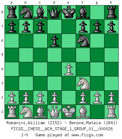 Last move : 1-0 2022 December 7 19:31:45 [Event "FICGS__CHESS__WCH_STAGE_1_GROUP_01__000026"] [Site "FICGS"] [Date "2022.11.02"] [Round "1"] [White "Romanini,William"] [Black "Benone,Mateia"] [Result "1-0"] [WhiteElo "2152"] [BlackElo "1841"] 1.e4 e5 2.Nf3 Nf6 3.Nxe5 d6 4.Nf3 1-0 This chess game has been lost on time (started : 2022.11.02 13:51:56) Follow this game move after move (download)Nonsense was the last thing Fischer was interested in, as far as Chess was concerned. (Elie Agur) Was ist der Unterschied zwischen einem Strassenarbeiter und einem Schachspieler? --Der Schachspieler bewegt sich ab und zu. (Anonymous) Vive, pierde y aprende al observar a tu oponente como gana. (Amber Steenbock) Il a essayé de se convaincre qu'il pourrait empêcher toutes les erreurs et ne jamais perdre. L'horreur ! Gary Kasparov au sujet de Robert Fischer. He who fights with monsters should be careful lest he thereby become a monster. (Friedrich Nietzsche, Beyond Good and Evil)