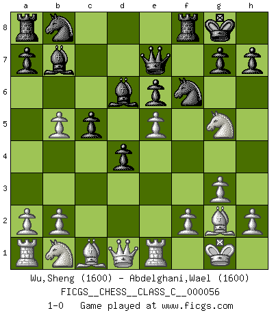 Last move : 1-0 2007 October 19 1:11:42 [Event "FICGS__CHESS__CLASS_C__000056"] [Site "FICGS"] [Date "2007.08.13"] [Round "1"] [White "Wu,Sheng"] [Black "Abdelghani,Wael"] [Result "1-0"] [WhiteElo "1600"] [BlackElo "1600"] 1.d4 Nf6 2.c4 e6 3.Nf3 b6 4.g3 Bb7 5.Bg2 c5 6.d5 b5 7.dxe6 fxe6 8.cxb5 d5 9.O-O Bd6 10.Re1 O-O 11.Ng5 Qe7 12.e4 d4 13.e5 1-0 Queen's Indian : 4.g3 Bb7 Kingside Castling by player White (move 9) Kingside Castling by player Black (move 10) Player White won this chess game. Follow this game move after move (download)Chess problems demand from the composer the same virtues that characterize all worthwhile art: originality, invention, conciseness, harmony, complexity, and splendid insincerity. (Vladimir Nabokov) Unter Putin wird alles Geld aus Russland wie von einem Staubsauger nach Moskau umgeleitet, das ist wie ein schwarzes Loch. (Garry Kasparov) El Ajedrez es una manera fabulosa para que los niños aprendan a autovalorarse y a autoestimarse. (Saudin Robovic) Même un GMI sait rarement calculer sur plus de cinq coups une attaque à sacrifices. (Rudolf Spielmann) The only thing that overcomes hard luck is hard work. (Harry Golden)