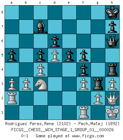 Last move : 0-1 2023 April 23 14:19:24 [Event "FICGS__CHESS__WCH_STAGE_1_GROUP_01__000026"] [Site "FICGS"] [Date "2022.11.02"] [Round "1"] [White "Rodriguez Perez,Rene"] [Black "Pech,Matej"] [Result "0-1"] [WhiteElo "2102"] [BlackElo "1892"] 1.e4 c5 2.Nf3 Nc6 3.d4 cxd4 4.Nxd4 Nf6 5.Nc3 e5 6.Ndb5 d6 7.Nd5 Nxd5 8.exd5 Nb8 9.c4 Be7 10.Nc3 O-O 11.Be2 f5 12.O-O Nd7 13.Be3 a5 14.b3 b6 15.f3 f4 16.Bf2 Qe8 17.Bd3 Nc5 18.Bxc5 bxc5 19.Qc2 Qh5 20.Ne4 Bf5 21.Nc3 g6 22.a3 Bd8 23.Kh1 Kh8 24.Rab1 Bb6 25.Na4 Ba7 26.Bxf5 gxf5 27.Nc3 Rf6 28.Qf2 Rg8 29.Qg1 Rh6 30.Na4 Qg5 31.Rb2 Qg3 32.R2b1 Qg7 33.Rf2 Qg6 34.Rbf1 Rh4 35.Rb1 Qh6 36.Re2 Rg5 37.Ra2 Rgh5 38.h3 Rg5 39.Rf1 Bb8 40.Nc3 Bc7 41.Qh2 Rg3 0-1 This chess game has been lost on time (started : 2022.11.02 13:51:56) Follow this game move after move (download)I feel as if I were a piece in a game of Chess, when my opponent says of it: That piece cannot be moved. (Soren Kierkegaard) Auf Remis zu spielen ist gewissermaßen ein Verbrechen gegen das Schachspiel. (Mikhail Nekhemyevich Tal) El Ajedrez es tortura mental. (Garry Kasparov) La vie et les Echecs sont tous les deux une lutte constante. (Lasker) The Internet is so big, so powerful and pointless that for some people it is a complete substitute for life. (Andrew Brown)