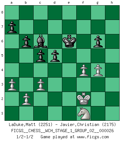 Last move : 1/2-1/2 2023 January 19 20:6:37 [Event "FICGS__CHESS__WCH_STAGE_1_GROUP_02__000026"] [Site "FICGS"] [Date "2022.11.02"] [Round "1"] [White "LaDuke,Matt"] [Black "Javier,Christian"] [Result "1/2-1/2"] [WhiteElo "2251"] [BlackElo "2175"] 1.e4 e5 2.Nf3 Nc6 3.Bb5 Nf6 4.O-O Nxe4 5.d4 Nd6 6.Bxc6 dxc6 7.dxe5 Nf5 8.Qxd8+ Kxd8 9.Nc3 Bd7 10.h3 b6 11.g4 Ne7 12.Ng5 Ke8 13.Rd1 Nd5 14.Nge4 Nb4 15.Rd2 h5 16.f3 Be7 17.a3 Nd5 18.Ne2 f5 19.exf6 Nxf6 20.N2g3 Nxe4 21.Nxe4 c5 22.Rd5 Bc6 23.Re5 Kf7 24.Bg5 Rae8 25.Bxe7 Rxe7 26.Rxe7+ Kxe7 27.Kg2 hxg4 28.hxg4 Re8 29.Ng3 Kf6 30.Kf2 g6 31.Rd1 Re6 32.Nf1 Rd6 33.Rxd6+ cxd6 34.f4 d5 35.c3 Ke6 1/2-1/2 Follow this game move after move (download)I have never in my life played the French Defence, which is the dullest of all openings. (Wilhelm Steinitz) Jeder leidlich begabte Spieler, er braucht keineswegs hervorragend veranlagt zu sein, kann es zum Meister bringen. Aber das ist ja auch gar nicht nötig! Der richtige Standpunkt ist es, zu seinem Vergnügen zu spielen, und man glaube ja nicht, dass der Genuss proportional dem Können sei. (Siegbert Tarrasch) Coloca el contenido de las piezas del Ajedrez en un sombrero, agitalo vigorosamente, arrojalas en un tablero desde una altura de 30 centimetros y así obtendras el estilo de Steinitz. (H. E. Bird) Les échecs, c'est l'imagination. (David Bronstein) To err is human, to shift the blame on someone else is tactical. (Mladen Jankovic)