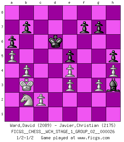 Last move : 1/2-1/2 2023 February 21 13:48:29 [Event "FICGS__CHESS__WCH_STAGE_1_GROUP_02__000026"] [Site "FICGS"] [Date "2022.11.02"] [Round "2"] [White "Ward,David"] [Black "Javier,Christian"] [Result "1/2-1/2"] [WhiteElo "2089"] [BlackElo "2175"] 1.e4 c5 2.Nf3 Nc6 3.d4 cxd4 4.Nxd4 Nf6 5.Nc3 e5 6.Ndb5 d6 7.Bg5 a6 8.Na3 Be7 9.Nc4 Be6 10.Bxf6 Bxf6 11.Nxd6+ Kf8 12.Nc4 Qd4 13.Ne3 Bg5 14.Qd2 h5 15.h4 Bf4 16.O-O-O Rh6 17.Kb1 Bxe3 18.fxe3 Qxd2 19.Rxd2 Rf6 20.b3 Rd8 21.Rxd8+ Nxd8 22.Rg1 Bg4 23.Kb2 Rf2 24.Kc1 Ne6 25.b4 Nc7 26.Bc4 Be6 27.Bd3 Ne8 28.a4 Nd6 29.Nd1 Rf6 30.Kd2 Ke7 31.a5 Nc4+ 32.Bxc4 Bxc4 33.Nb2 Rf2+ 34.Kc3 Be2 35.Nd3 Rf1 36.Rxf1 Bxf1 37.g3 Kd6 38.Kd2 Bh3 39.Nc5 Kc6 40.Kd3 Bg2 41.Kc3 Kc7 42.Kd2 Bh3 43.Na4 Kc6 44.Nc5 Bg2 45.Ke2 Bh3 46.Ke1 Bg4 47.Kd2 Bh3 48.Nd3 Kd6 49.Kc3 Bf1 50.Kb3 Bh3 51.Nb2 1/2-1/2 Follow this game move after move (download)After a bad opening, there is hope for the middle game. After a bad middle game, there is hope for the endgame. But once you are in the endgame, the moment of truth has arrived. (Edmar Mednis) Schach wird sich dank seiner hohen kulturellen Tradition immer durchsetzen. In näherer Zukunft womöglich sogar als Gegenreaktion auf die maßlose Reizüberflutung im Freizeit- und Spielbereich. (Garry Kasparov) a manera como él juega al Ajedrez, demuestra la completa naturaleza de un hombre. (Stanley Ellin) On peut tirer plus d'utilité d'une partie perdue que de 100 parties gagnées. (Capablanca) In God we trust, all others we virus scan. (Anonymous)