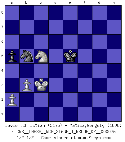 Last move : 1/2-1/2 2023 June 10 11:14:47 [Event "FICGS__CHESS__WCH_STAGE_1_GROUP_02__000026"] [Site "FICGS"] [Date "2022.11.02"] [Round "2"] [White "Javier,Christian"] [Black "Matisz,Gergely"] [Result "1/2-1/2"] [WhiteElo "2175"] [BlackElo "1898"] 1.Nf3 Nf6 2.d4 e6 3.c4 b6 4.g3 Ba6 5.Qc2 Bb7 6.Bg2 c5 7.d5 exd5 8.cxd5 Nxd5 9.O-O Nc6 10.Qa4 Be7 11.Rd1 Nf6 12.Nh4 g6 13.Bh6 Bf8 14.Bg5 Be7 15.Bh6 Bf8 16.Bg5 Be7 17.Nc3 O-O 18.Rd2 Rb8 19.Bf4 Rc8 20.Rad1 a6 21.Bd6 Re8 22.Qf4 Nh5 23.Bxe7 Qxe7 24.Qd6 Nf6 25.Na4 Rb8 26.Nxb6 Nd4 27.Qxe7 Rxe7 28.e3 Bxg2 29.exd4 Bc6 30.dxc5 Kg7 31.Ng2 R7e8 32.Rc2 Ne4 33.Ne3 d6 34.h4 dxc5 35.Nbc4 Re6 36.Rd3 Rbe8 37.b3 g5 38.hxg5 Kf8 39.f4 Nxg3 40.Rh2 Re4 41.Rd6 Bb5 42.Rf6 Ne2+ 43.Kf2 Bxc4 44.Nxc4 Rxf4+ 45.Rxf4 Nxf4 46.Rxh7 Nd3+ 47.Kf3 Ne5+ 48.Kg3 Re6 49.Rh4 Nd3 50.Kf3 Ne1+ 51.Kf2 Nc2 52.Rh6 Rxh6 53.gxh6 Kg8 54.Nd6 Kh7 55.Ke2 Kxh6 56.Kd2 Na3 57.Nxf7+ Kg6 58.Nd6 Kf6 59.Ne4+ Ke5 60.Nxc5 a5 61.Kc3 Nb5+ 1/2-1/2 Follow this game move after move (download)For me, Chess is life and every game is like a new life. Every Chess player gets to live many lives in one lifetime. (Eduard Gufeld) Das Blackmar-Diemer-Gambit verändert den ganzen Menschen! (Emil Joseph Diemer) Realmente no sabemos como el juego fue inventado, aunque hay sospechas. Tan pronto como descubramos a los culpables, se los haremos saber. (Bruce Pandolfini) Aux échecs, les retours au sommet sont rares : les dommages psychologiques consécutifs à une défaite sont trop sévères. (Daily Telegraph) Memory is a way of holding onto the things you love, the things you are, the things you never want to lose. (from the television show: The Wonder Years)
