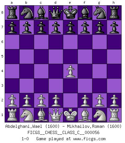 Last move : 1-0 2007 September 23 3:34:47 [Event "FICGS__CHESS__CLASS_C__000056"] [Site "FICGS"] [Date "2007.08.13"] [Round "1"] [White "Abdelghani,Wael"] [Black "Mikhailov,Roman"] [Result "1-0"] [WhiteElo "1600"] [BlackElo "1600"] 1.e4 1-0 This chess game has been lost on time (started : 2007.08.13 4:30:52) King's pawn Opening Player White won this chess game. Follow this game move after move (download)You have to have the fighting spirit. You have to force moves and take chances. (Bobby Fischer) Kleine Schachspieler machen Mist, und große Schachspieler machen Mist, aber große machen weniger Mist. (Fritz Sämisch) Una clavada es mas poderosa que una espada. (Fred Reinfeld) Même si l'adversaire joue le coup analysé précédemment, recommencez l'analyse en voyant la nouvelle position. Première règle de Blumenfeld All maxims have their antagonist maxims; proverbs should be sold in pairs, a single one being but a half truth. (William Mathews)