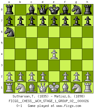 Last move : 0-1 2022 December 31 11:14:54 [Event "FICGS__CHESS__WCH_STAGE_1_GROUP_02__000026"] [Site "FICGS"] [Date "2022.11.02"] [Round "2"] [White "Sutharsan,Thirunathan"] [Black "Matisz,Gergely"] [Result "0-1"] [WhiteElo "1835"] [BlackElo "1898"] 1.e4 Na6 0-1 This chess game has been lost on time (started : 2022.11.02 13:51:57) Follow this game move after move (download)Chess, like love, is infectious at any age. (Flohr) Den Ruhm habe ich schon, jetzt brauche ich noch das Geld. (Wilhelm Steinitz) Bobby Fischer es el jugador de Ajedrez mas grande que jamás haya existido. (Ken Smith) Je fais ceci parce que dans cinquante coups j'obtiendrai cela; je m'appelle Mikhail Moisevitch Botvinnik. (Botvinnik) Experiences are the keys to life. (Daniel Parmet)