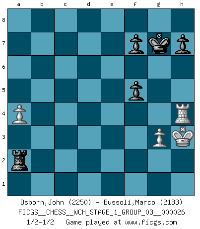 Last move : 1/2-1/2 2022 December 7 16:51:31 [Event "FICGS__CHESS__WCH_STAGE_1_GROUP_03__000026"] [Site "FICGS"] [Date "2022.11.02"] [Round "1"] [White "Osborn,John"] [Black "Bussoli,Marco"] [Result "1/2-1/2"] [WhiteElo "2250"] [BlackElo "2183"] 1.e4 c5 2.Nf3 d6 3.Nc3 Nf6 4.d4 cxd4 5.Nxd4 a6 6.Be2 e5 7.Nb3 Be7 8.O-O O-O 9.Qd2 a5 10.a4 Be6 11.Bf3 Na6 12.Nd5 b6 13.Nxf6+ Bxf6 14.Qd1 Rc8 15.h3 Bg5 16.Bg4 Nc7 17.Bxg5 Qxg5 18.Nd2 d5 19.Bxe6 Nxe6 20.Nf3 Qh5 21.exd5 Nf4 22.g3 Nxh3+ 23.Kg2 Qf5 24.Nh4 Qd7 25.Qh5 g6 26.Qxe5 Rc5 27.Rad1 Re8 28.Qf6 Rxc2 29.b3 R8e2 30.Nf5 Qxf5 31.Qxf5 gxf5 32.Kxh3 Rcd2 33.b4 axb4 34.Rxd2 Rxd2 35.Rb1 Rd4 36.d6 Kf8 37.Rc1 Rxd6 38.Rc4 Rd2 39.Rxb4 Rxf2 40.Rxb6 Ra2 41.Rb4 Kg7 42.Rh4 1/2-1/2 Follow this game move after move (download)Fischer, who may or may not be mad as a hatter, has every right to be horrified. (Jeremy Silman) Ich liebe den Moment, wenn ich das Ego meines Gegenüber breche. (Robert James Fischer) El juego de Fischer siempre fue nítido, racional y brillante. Uno de los mejores por siempre. (Dave Regis) Nous sommes les pions de la mystérieuse partie d'Echecs jouée par Dieu. Il nous déplace, nous arrête, nous pousse encore, puis nous lance un à un dans la boîte du Néant. Epitaphe sur la tombe de David Janowsky (1868-1927). The bottom line is always the bottom line. (Johann Piek)