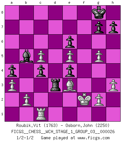 Last move : 1/2-1/2 2022 December 21 9:39:35 [Event "FICGS__CHESS__WCH_STAGE_1_GROUP_03__000026"] [Site "FICGS"] [Date "2022.11.02"] [Round "1"] [White "Roubik,Vit"] [Black "Osborn,John"] [Result "1/2-1/2"] [WhiteElo "1763"] [BlackElo "2250"] 1.e4 c5 2.Nf3 e6 3.c4 Nc6 4.Nc3 Nd4 5.Bd3 Ne7 6.Nxd4 cxd4 7.Ne2 Nc6 8.O-O b6 9.Bc2 Bd6 10.a3 Qc7 11.f4 a5 12.d3 O-O 13.Ba4 f5 14.e5 Be7 15.Bxc6 dxc6 16.Nxd4 Qd7 17.Be3 Rd8 18.Qe2 Ba6 19.Rfd1 c5 20.Nf3 a4 21.Rab1 Rac8 22.h3 b5 23.d4 bxc4 24.dxc5 Qb7 25.Qc2 Qe4 26.Qxe4 fxe4 27.Rxd8+ Rxd8 28.Ng5 Rd3 29.Kf2 Bxg5 30.fxg5 Bb5 31.Rc1 Rb3 32.Bd4 Rd3 33.Be3 Rb3 34.Bd4 Rd3 35.Be3 1/2-1/2 Follow this game move after move (download)The game of chess is the touchstone of the intellect. (Goethe) Wenn Spassky eine Figur opfert kannst du genauso gut aufgeben. Aber wenn Tal eine Figur opfert, spiel weiter. Er könnte noch eine weitere opfern, und dann ... wer weiß? (Miguel Najdorf) Aquel que toma al Peón de Caballo de la Reina, se pasará la noche a dormir en la calle. (Anónimo) J'apprécie les joueurs d'est-indienne, c'est grâce à eux que je nourris ma famille depuis tant d'années. (Petrosian) Man is reluctant to give credit for intelligence to anyone, except his enemies. (Albert Einstein)