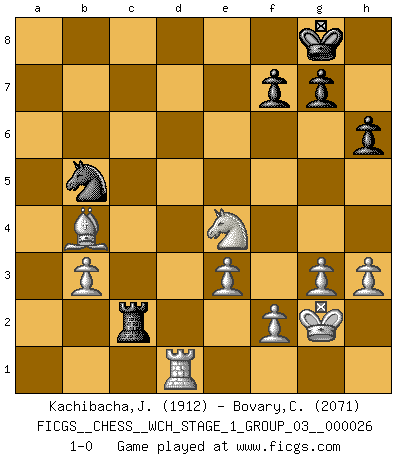 Last move : 1-0 2023 March 28 17:14:51 [Event "FICGS__CHESS__WCH_STAGE_1_GROUP_03__000026"] [Site "FICGS"] [Date "2022.11.02"] [Round "2"] [White "Kachibacha,Jobadi"] [Black "Bovary,Charles"] [Result "1-0"] [WhiteElo "1912"] [BlackElo "2071"] 1.d4 d5 2.c4 e6 3.Nc3 c5 4.cxd5 cxd4 5.Qa4+ Bd7 6.Qxd4 exd5 7.Qxd5 Nf6 8.Qd1 Bc5 9.e3 Qe7 10.Nf3 Nc6 11.Be2 O-O 12.O-O Rac8 13.Qb3 a6 14.Qxb7 a5 15.Rd1 Rfd8 16.b3 Bd6 17.Bb2 Ra8 18.Qb5 Ne5 19.Qb6 Nc6 20.Nd4 Nb4 21.a3 Bc5 22.Qb7 Bxd4 23.Rxd4 Nc2 24.Rxd7 Qxd7 25.Qxd7 Rxd7 26.Rc1 Rd2 27.Bf3 Rc8 28.Na4 Rd3 29.g3 h6 30.h3 Kh8 31.Bd1 Rd2 32.Bf3 Rd3 33.Bd1 Rd2 34.Bc3 Rxd1+ 35.Rxd1 Nxa3 36.Bxa5 Rc2 37.Bb4 Nb5 38.Nc5 Kg8 39.Kg2 Ne4 40.Nxe4 1-0 Follow this game move after move (download)You need not play well - just help your opponent to play badly. (Genrikh Chepukaitis) Ich verstehe den Grund nicht, warum die Aufteilung in Frauen und Männer überhaupt im Schach besteht. (Judith Polgar) Fischer deseaba darle a los Rusos una sopa de su propia medicina. (Larry Evans) Donnez-moi un Cavalier en 6e et je gagnerais toutes mes parties. (Steinitz) Gambling is the son of avarice and the father of despair. (French proverb)