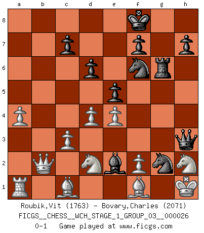 Last move : 0-1 2023 January 5 16:33:3 [Event "FICGS__CHESS__WCH_STAGE_1_GROUP_03__000026"] [Site "FICGS"] [Date "2022.11.02"] [Round "1"] [White "Roubik,Vit"] [Black "Bovary,Charles"] [Result "0-1"] [WhiteElo "1763"] [BlackElo "2071"] 1.e4 e5 2.Nf3 Nc6 3.Bc4 Nf6 4.d3 Bc5 5.c3 d6 6.O-O Bg4 7.h3 Bh5 8.Nbd2 a6 9.a4 Ba7 10.b4 Qd7 11.Re1 g5 12.d4 g4 13.hxg4 Qxg4 14.b5 Rg8 15.Bf1 Nd8 16.Qb3 Ne6 17.bxa6 Nf4 18.axb7 Nh3+ 19.Kh2 Rd8 20.Re2 Rg6 21.Qb5+ Kf8 22.Qa6 Nf4 23.Qxa7 Nxg2 24.b8Q Rxb8 25.Qxb8+ Ne8 26.Kh1 Qh3+ 27.Nh2 Bxe2 28.Qb2 Nf6 0-1 Follow this game move after move (download)The winner of the game is the player who makes the next-to-last mistake. (Savielly Tartakover) Der Bart als Geschlechtszeichen mitten im Gesicht ist obszön. Daher gefällt er den Weibern. [Zugegeben, kein Schachzitat, aber unglaublich originell] (Arthur Schopenhauer) Cuando le juegas a Fischer, no es una cuestion de si vas a ganar o perder. Es una cuestion de si vas a sobrevivir. (Boris Spassky) On n'a jamais que l'âge auquel on a commence à jouer aux échecs car après on cesse de vieillir. (Capablanca) I feel so... helpless. (C-3PO in Star Wars ep.3)