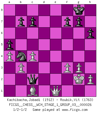 Last move : 1/2-1/2 2023 February 26 12:45:12 [Event "FICGS__CHESS__WCH_STAGE_1_GROUP_03__000026"] [Site "FICGS"] [Date "2022.11.02"] [Round "1"] [White "Kachibacha,Jobadi"] [Black "Roubik,Vit"] [Result "1/2-1/2"] [WhiteElo "1912"] [BlackElo "1763"] 1.c4 e5 2.Nc3 Nf6 3.Nf3 Nc6 4.g3 Bb4 5.Bg2 O-O 6.O-O e4 7.Ne1 Bxc3 8.dxc3 h6 9.Nc2 d6 10.Ne3 Re8 11.b3 a5 12.a4 Be6 13.f4 exf3 14.exf3 Ne7 15.Ra2 d5 16.cxd5 Nexd5 17.Nxd5 Nxd5 18.c4 Nb4 19.Rd2 Qe7 20.Re1 Rad8 21.Bh3 Qc5+ 22.Kg2 Rxd2+ 23.Qxd2 Bxh3+ 24.Kxh3 Qf5+ 25.Kg2 Rxe1 26.Qxe1 Qc2+ 27.Kh3 Qf5+ 28.Kg2 Qc2+ 1/2-1/2 Follow this game move after move (download)Tactics flow from a superior position. (Bobby Fischer) Irgendwie scheint mir sonntags früh um 9 Uhr der Killerinstinkt verloren gegangen zu sein. (Alexej Shirov) El Ajedrez es en su esencia, un juego. En su forma, un arte. Y en su ejecución, una ciencia. (Baron Tassilo) Botvinnik disait en comparant les échecs à la musique: Il existe une science dont le but est l'étude de l'acoustique et des sons. Mais il y a aussi un art qui se sert de l'océan des sons : c'est la musique. De toute évidence, il en est de même pour la pensée. La logique est l'étude des lois de la réflexion et les échecs reflètent, en tant qu'art, le côté logique de la réflexion, sous la forme d'images artistiques... Extrait de Fischer - Spassky, Reykjavik 1972 par Alexander & F. Wyndham (Ed. Solar), p 37. Somewhere in the world there is an epigram for every dilemma. (Hendrik Willem van Loon)