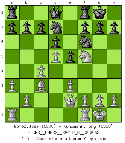 Last move : 1-0 2007 October 19 13:13:42 [Event "FICGS__CHESS__RAPID_B__000063"] [Site "FICGS"] [Date "2007.08.14"] [Round "1"] [White "Gomez,Jose"] [Black "Kuhlmann,Tony"] [Result "1-0"] [WhiteElo "1600"] [BlackElo "1560"] 1.d4 Nf6 2.c4 e6 3.Nc3 Bb4 4.Qc2 Nc6 5.Nf3 d6 6.Bd2 O-O 7.a3 Bxc3 8.Bxc3 Qe7 9.e3 e5 10.d5 Nb8 11.Be2 Bg4 12.O-O Nbd7 13.Nh4 Bxe2 14.Nf5 Qd8 15.Qxe2 1-0 This chess game has been lost on time (started : 2007.08.14 6:51:31) Nimzo-Indian : Classical, Milner-Barry (Zurich) variation Kingside Castling by player Black (move 6) Kingside Castling by player White (move 12) Player White won this chess game. Follow this game move after move (download)Live, lose, and learn, by observing your opponent how to win. (Amber Steenbock) Wenn ich einen Club besuche, sind die Spieler stumm vor Staunen. (José Raúl Capablanca) Algunos sacrificios son sólidos, los demás son míos. (Mikhail Tal) Il vaut mieux sacrifier les pièces de l'adversaire. (Xavier Tartacover) Do not put your faith in what statistics say until you have carefully considered what they do not say. (William W. Watt)