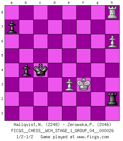 Last move : 1/2-1/2 2023 January 21 16:39:31 [Event "FICGS__CHESS__WCH_STAGE_1_GROUP_04__000026"] [Site "FICGS"] [Date "2022.11.02"] [Round "2"] [White "Hallqvist,Niklas"] [Black "Zerowska,Patrycja"] [Result "1/2-1/2"] [WhiteElo "2248"] [BlackElo "2046"] 1.Nf3 d5 2.g3 Nf6 3.Bg2 g6 4.O-O Bg7 5.c4 dxc4 6.Qa4+ Nfd7 7.Rd1 O-O 8.Qxc4 Nb6 9.Qc2 Nc6 10.d4 Bf5 11.e4 Bg4 12.d5 Bxf3 13.Bxf3 Nd4 14.Qd3 c5 15.Bg2 c4 16.Qd2 e5 17.dxe6 fxe6 18.Nc3 Rf3 19.Rb1 Rd3 20.Qe1 Nc2 21.Rxd3 Qxd3 22.Qd2 Na3 23.Qxd3 cxd3 24.bxa3 Bxc3 25.Be3 Nc4 26.Bh3 Nxe3 27.Bxe6+ Kg7 28.fxe3 Kf6 29.Bg4 Re8 30.Kf2 b6 31.Rb3 Rxe4 32.Rxc3 Rxg4 33.Rxd3 Ra4 34.Kf3 Ke5 35.h4 b5 36.g4 h5 37.gxh5 gxh5 38.Rd7 Rxa3 39.Rh7 Kd5 40.Rxh5+ Kc4 41.Rh8 Rxa2 42.h5 b4 43.h6 Rh2 1/2-1/2 Follow this game move after move (download)You can only get good at Chess if you love the game. (Bobby Fischer) Als ich elf wurde, wurde ich einfach gut. (Robert James Fischer) El Ajedrez, como la música, como el amor, tiene el poder de hacer feliz a la gente. (Siegbert Tarrasch) Le succès, c'est être capable d'aller d'échec en échec sans perdre son enthousiasme. (Winston Churchill) The man who strikes first admits that his ideas have given out. (Chinese proverb)