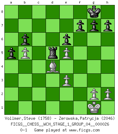 Last move : 0-1 2022 December 17 13:5:58 [Event "FICGS__CHESS__WCH_STAGE_1_GROUP_04__000026"] [Site "FICGS"] [Date "2022.11.02"] [Round "1"] [White "Vollmer,Steve"] [Black "Zerowska,Patrycja"] [Result "0-1"] [WhiteElo "1758"] [BlackElo "2046"] 1.d4 Nf6 2.c4 e6 3.Nf3 d5 4.e3 Be7 5.Nc3 O-O 6.Bd3 dxc4 7.Bxc4 a6 8.a4 b6 9.O-O Bb7 10.b3 c5 11.dxc5 Bxc5 12.Bb2 Nc6 13.Qe2 Qe7 14.Rad1 Na5 15.Ne5 Bd6 16.Ng4 Nxg4 17.Qxg4 Be5 18.Rd3 Nxc4 19.bxc4 Rad8 20.Rfd1 Rxd3 21.Rxd3 Qb4 22.Qe2 Qxc4 23.Qd2 a5 24.f4 Ba6 25.fxe5 Qxd3 26.Qxd3 Bxd3 27.Nb5 Bxb5 28.axb5 Rd8 29.Bd4 Rd5 0-1 Follow this game move after move (download)In Chess, as it is played by masters, chance is practically eliminated. (Emanuel Lasker) Ich habe die besten Aussichten, den ersten Preis zu gewinnen - denn jeder muss gegen Steinitz spielen, nur ich nicht! (Wilhelm Steinitz) El estómago es una parte esencial del maestro de Ajedrez. (Bent Larsen) On n'a jamais que l'âge auquel on a commence à jouer aux échecs car après on cesse de vieillir. (Capablanca) The worth of a book is to be measured by what you can carry away from it. (James Bryce)