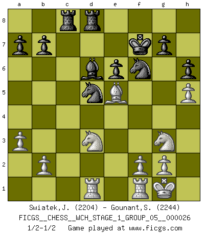 Last move : 1/2-1/2 2022 December 10 21:45:41 [Event "FICGS__CHESS__WCH_STAGE_1_GROUP_05__000026"] [Site "FICGS"] [Date "2022.11.02"] [Round "2"] [White "Swiatek,Janusz"] [Black "Gounant,Stanislas"] [Result "1/2-1/2"] [WhiteElo "2204"] [BlackElo "2244"] 1.e4 c6 2.d4 d5 3.Nc3 dxe4 4.Nxe4 Bf5 5.Ng3 Bg6 6.h4 h6 7.Nf3 Nd7 8.h5 Bh7 9.Bd3 Bxd3 10.Qxd3 e6 11.Bf4 Qa5+ 12.Bd2 Bb4 13.c3 Be7 14.c4 Qc7 15.d5 cxd5 16.cxd5 Qd6 17.Qb3 Ngf6 18.dxe6 Qxe6+ 19.Qxe6 fxe6 20.O-O Kf7 21.Rad1 Rhd8 22.Bc3 Nd5 23.Be5 Rac8 24.a3 N7f6 25.Bd4 Rc2 26.Ne1 R2c8 27.Nd3 Bd6 28.Be5 1/2-1/2 Follow this game move after move (download)All I want to do, ever, is just play Chess. (Bobby Fischer) Es macht mich traurig, wenn ich sehe, dass Golfprofis mehr verdienen als Schachsportler. Obwohl ich davon überzeugt bin, dass wir Schachspieler viel härter trainieren müssen als die Golfer. (Alexandra Kosteniuk) Ser exitoso en el Ajedrez te permite descubrir tu propia personalidad. Eso es lo que deseo para los niños de mi clase. (Saudin Robovic) On a dit que l'homme se distingue de l'animal par le fait qu'il achète plus de livres qu'il ne peut en lire. Je voudrais suggérer qu'inclure à la liste des livres quelques livres d'échecs rendrait la distinction manifeste. (Edward Lasker) Follow your passion, and success will follow you. (Arthur Buddhold)