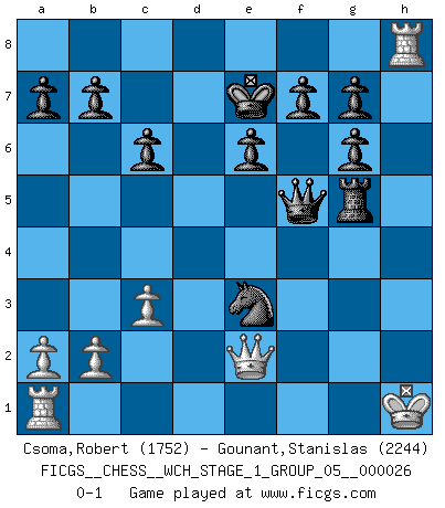Last move : 0-1 2022 December 20 16:56:48 [Event "FICGS__CHESS__WCH_STAGE_1_GROUP_05__000026"] [Site "FICGS"] [Date "2022.11.02"] [Round "1"] [White "Csoma,Robert"] [Black "Gounant,Stanislas"] [Result "0-1"] [WhiteElo "1752"] [BlackElo "2244"] 1.d4 d5 2.Nc3 c6 3.e4 dxe4 4.Nxe4 Bf5 5.Ng3 Bg6 6.Nf3 Nd7 7.Bd3 e6 8.O-O Ngf6 9.Be3 Bd6 10.Ne2 Qc7 11.Qd2 Bh5 12.Ne5 Nxe5 13.dxe5 Bxe5 14.Ng3 Bg6 15.Bxg6 hxg6 16.c3 Ng4 17.h3 Bxg3 18.fxg3 Rxh3 19.gxh3 Qxg3+ 20.Kh1 Qxh3+ 21.Kg1 Nxe3 22.Rf2 Rd8 23.Qe2 Rd5 24.Rh2 Rg5+ 25.Kh1 Qf5 26.Rh8+ Ke7 0-1 Follow this game move after move (download)Fischer wanted to give the Russians a taste of their own medicine. (Larry Evans) In der Schule lernt man nichts. Es ist nur Zeitverschwendung. (Robert James Fischer) Vive, pierde y aprende al observar a tu oponente como ganar. (Amber Steenbock) L'attaque fait le spectacle, la défense gagne les matchs. (Dicton footballistique) It is not true that people stop pursuing dreams because they grow old, they grow old because they stop pursuing dreams. (Gabriel Garcia Marquez)