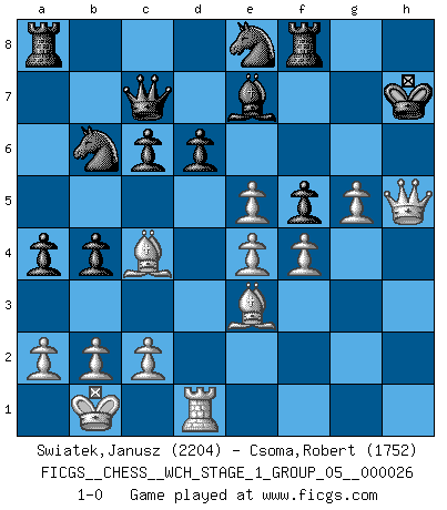 Last move : 1-0 2022 December 29 18:2:46 [Event "FICGS__CHESS__WCH_STAGE_1_GROUP_05__000026"] [Site "FICGS"] [Date "2022.11.02"] [Round "1"] [White "Swiatek,Janusz"] [Black "Csoma,Robert"] [Result "1-0"] [WhiteElo "2204"] [BlackElo "1752"] 1.e4 d6 2.d4 Nf6 3.Nc3 c6 4.f4 Qc7 5.Nf3 Bg4 6.h3 Bxf3 7.Qxf3 e5 8.Be3 Be7 9.g4 O-O 10.g5 Ne8 11.O-O-O Nd7 12.Kb1 a5 13.h4 a4 14.Ne2 b5 15.Ng3 b4 16.Nf5 Nb6 17.dxe5 Nc8 18.Bc4 g6 19.Nh6+ Kg7 20.h5 Nb6 21.hxg6 fxg6 22.Nf5+ gxf5 23.Rxh7+ Kxh7 24.Qh5+ 1-0 Follow this game move after move (download)I believe that Chess possesses a magic that is also a help in advanced age. A rheumatic knee is forgotten during a game of Chess and other events can seem quite unimportant in comparison with a catastrophe on the chessboard. (Vlastimil Hort) Früher wurde jeder komplizierte Zug, jedes interessante Opfer mit großem Beifall und Enthusiasmus aufgenommen. Heute schaltet man einfach seinen Fritz an, und man kann sehen, was los ist, ob der Zug geht oder nicht. (Vladimir Kramnik) Bobby Fischer es el mas grande genio de Ajedrez de todos los tiempos. (Alexander Kotov) Les Echecs sont et restent toujours un combat, un combat intégral comme la boxe, la lutte ou un autre sport, et où il doit y avoir un vainqueur et un vaincu. (Joseph Emil Diemer) History is the quarrels of popes and kings, with wars or pestilences in every page; the men all so good for nothing, and hardly any women at all. (Jane Austen)