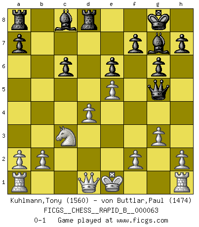 Last move : 0-1 2007 November 8 6:54:16 [Event "FICGS__CHESS__RAPID_B__000063"] [Site "FICGS"] [Date "2007.08.14"] [Round "1"] [White "Kuhlmann,Tony"] [Black "von Buttlar,Paul"] [Result "0-1"] [WhiteElo "1560"] [BlackElo "1474"] 1.d4 Nf6 2.c4 g6 3.Nc3 d5 4.Nf3 Bg7 5.Bg5 Ne4 6.cxd5 Nxg5 7.Nxg5 e6 8.e4 Qxg5 9.e5 O-O 10.g3 c5 11.dxc6 Nxc6 12.Bg2 Rd8 13.Bxc6 bxc6 0-1 This chess game has been lost on time (started : 2007.08.14 6:51:31) King's Indian defense, 3.Nc3 Kingside Castling by player Black (move 9) Player Black won this chess game. Follow this game move after move (download)When you absolutely don't know what to do anymore, it is time to panic. (John van der Wiel) Auf Remis zu spielen ist gewissermaßen ein Verbrechen gegen das Schachspiel. (Mikhail Nekhemyevich Tal) Muchos se han convertido en Maestros de Ajedrez, nadie se ha convertido en el Maestro del Ajedrez. (Siegbert Tarrasch) Horreur, mais aussi harmonie suprême : qu'y avait-il en effet au monde en dehors des échecs ? Le brouillard, l'inconnu, le non-être... (Vladimir Nabokov) Perception is reality. (Immanuel Kant)