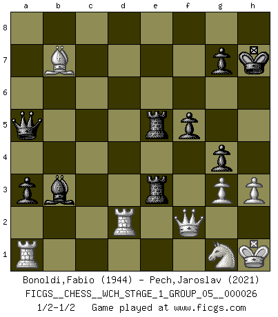 Last move : 1/2-1/2 2023 April 25 1:58:49 [Event "FICGS__CHESS__WCH_STAGE_1_GROUP_05__000026"] [Site "FICGS"] [Date "2022.11.02"] [Round "2"] [White "Bonoldi,Fabio"] [Black "Pech,Jaroslav"] [Result "1/2-1/2"] [WhiteElo "1944"] [BlackElo "2021"] 1.c4 e5 2.g3 Nf6 3.Bg2 d5 4.cxd5 Nxd5 5.Nc3 Nb6 6.Nf3 Nc6 7.O-O Be7 8.a3 Be6 9.d3 O-O 10.b4 a5 11.b5 Nd4 12.Nd2 c6 13.bxc6 Nxc6 14.Rb1 a4 15.Bb2 Ra5 16.Kh1 h6 17.f4 f5 18.Qe1 exf4 19.Rxf4 Bg5 20.Rf1 Nd4 21.e3 Nc2 22.Qe2 Re8 23.Nf3 Bb3 24.Nxg5 Rxe3 25.Qf2 hxg5 26.Rfc1 Rxd3 27.Rxc2 Nc4 28.Re2 Nxb2 29.Qe1 Qd4 30.Rexb2 Re5 31.Ne2 Qc5 32.Qf1 Rde3 33.Ng1 g4 34.Bxb7 Qxa3 35.Bg2 Kh7 36.Qf2 Qb4 37.Rd2 a3 38.Ra1 Qc5 39.h3 Qa5 40.Bb7 Be6 41.Bg2 Bb3 42.Bb7 1/2-1/2 Follow this game move after move (download)In Chess, at least, the brave inherit the earth. (Edmar Mednis) Ein Kibitz ist einer, der deinem Gegner gute Ratschläge gibt. (Andrew Soltis) Aquellos que dicen que entienden al Ajedrez, no entienden nada. (Robert Hubner) Ce qui caractérise les parties de combat, c'est que si le défenseur a constamment de difficiles problèmes à résoudre, l'attaquant doit chercher sans relâche de nouvelles possibilités d'attaque. (Koblentz) Employ the attack like tactic of defense. (Chinese proverb)