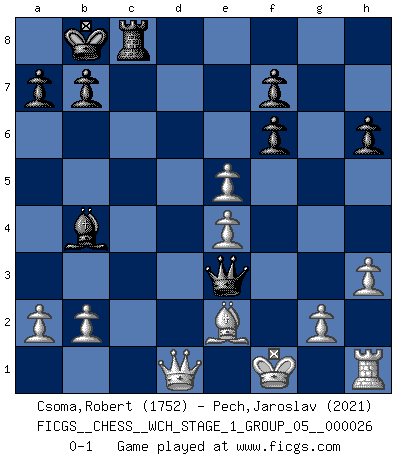Last move : 0-1 2023 February 13 0:20:33 [Event "FICGS__CHESS__WCH_STAGE_1_GROUP_05__000026"] [Site "FICGS"] [Date "2022.11.02"] [Round "1"] [White "Csoma,Robert"] [Black "Pech,Jaroslav"] [Result "0-1"] [WhiteElo "1752"] [BlackElo "2021"] 1.d4 d5 2.Nc3 Nf6 3.Bg5 Nbd7 4.f3 c6 5.e4 dxe4 6.fxe4 e5 7.Nf3 h6 8.Bh4 Qb6 9.Rb1 exd4 10.Nxd4 Ne5 11.Bxf6 gxf6 12.Nce2 Bg4 13.h3 Bxe2 14.Bxe2 O-O-O 15.c3 c5 16.Qc2 cxd4 17.cxd4 Kb8 18.dxe5 Bb4+ 19.Kf1 Qe3 20.Rd1 Rxd1+ 21.Qxd1 Rc8 0-1 Follow this game move after move (download)Bobby Fischer is the greatest Chess player who has ever lived. (Ken Smith) Ihnen, Herr Lasker, habe ich nur drei Worte zu sagen: Schach und matt. (Siegbert Tarrasch) ¿Quién es tu oponente esta tarde? Esta tarde mi oponente son las piezas negras. (Akiba Rubinstein) Toutes choses étant égales, c'est la conviction qui gagne. Alliée à une volonté de vaincre, elle sert de détonateur, suscite des idées, disperse les doutes et aide à penser clairement. (Robert Fischer) There will be no order, only chaos. (Sol Robeson in Pi by Darren Aronofsky)