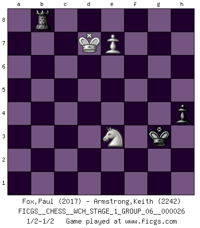 Last move : 1/2-1/2 2023 April 19 4:53:26 [Event "FICGS__CHESS__WCH_STAGE_1_GROUP_06__000026"] [Site "FICGS"] [Date "2022.11.02"] [Round "1"] [White "Fox,Paul"] [Black "Armstrong,Keith"] [Result "1/2-1/2"] [WhiteElo "2017"] [BlackElo "2242"] 1.e4 c5 2.Nf3 d6 3.d4 cxd4 4.Nxd4 Nf6 5.Nc3 a6 6.f4 e5 7.Nf3 Nbd7 8.a4 Qc7 9.Bd3 Be7 10.Be3 O-O 11.O-O Nc5 12.Kh1 Bd7 13.a5 Rac8 14.Nd2 exf4 15.Bxf4 Be6 16.h3 Nxd3 17.cxd3 Qc5 18.Ra4 d5 19.Nb3 Qa7 20.e5 Nd7 21.Ne2 b5 22.axb6 Qxb6 23.Nbd4 Bc5 24.Be3 Qxb2 25.Rxa6 Rfe8 26.Ra5 Qb8 27.Nxe6 Bxe3 28.Nxg7 Kxg7 29.d4 Qb2 30.Rxd5 Nf8 31.Qd3 Bg5 32.Rb5 Qc2 33.Qxc2 Rxc2 34.Ng3 Rc1 35.Rxc1 Bxc1 36.Rc5 Bb2 37.Rb5 Ba1 38.Ra5 Bb2 39.Nf5+ Kg6 40.g4 Ne6 41.d5 Nd4 42.Ra2 Rb8 43.Rxb2 Rxb2 44.Nxd4 Kg5 45.Kg1 Kf4 46.e6 fxe6 47.dxe6 Kg3 48.Nf5+ Kxh3 49.Kf1 Rb4 50.Nd6 Rf4+ 51.Kg1 Rxg4+ 52.Kf2 Rf4+ 53.Kg1 Rg4+ 54.Kf2 Rg7 55.Nf5 Rg5 56.Nd6 Rg2+ 57.Kf3 Rg6 58.Ne4 h6 59.Nc5 Rg8 60.Kf4 h5 61.Ne4 Kg2 62.Ng5 Rf8+ 63.Ke5 Kg3 64.e7 Re8 65.Ke6 Kg4 66.Ne4 Kf4 67.Nd2 Rb8 68.Kd7 Ke3 69.Nf1+ Kf2 70.Nd2 h4 71.Ne4+ Kf3 72.Ng5+ Kg4 73.Ne4 Kf4 74.Nd2 Ke3 75.Nf1+ Kf2 76.Nh2 Kg2 77.Ng4 Kg3 78.Ne3 1/2-1/2 Follow this game move after move (download)When you are lonely, when you feel yourself an alien in the world, play Chess. This will raise your spirits and be your counselor in war. (Aristotle) Schach ist Leben. (Robert James Fischer) Es muy difícil jugar en contra de la teoría de Einstein. - en su primera derrota en contra de Fischer (Mikhail Tal) Les Echecs mettent en conflit, non pas deux intelligences, mais deux volontés. (Lasker) Vladimir Ras-Putin is still alive... He is also a good actor, I saw him in the Lord of the Rings. (Rodolfo d'Ettorre)