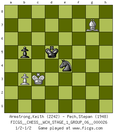 Last move : 1/2-1/2 2023 May 2 0:15:28 [Event "FICGS__CHESS__WCH_STAGE_1_GROUP_06__000026"] [Site "FICGS"] [Date "2022.11.02"] [Round "1"] [White "Armstrong,Keith"] [Black "Pech,Stepan"] [Result "1/2-1/2"] [WhiteElo "2242"] [BlackElo "1948"] 1.Nf3 Nf6 2.c4 c5 3.Nc3 Nc6 4.g3 d5 5.d4 e6 6.cxd5 exd5 7.Bg2 Be7 8.O-O O-O 9.dxc5 Bxc5 10.Na4 Be7 11.Be3 Bg4 12.Rc1 Re8 13.h3 Bxf3 14.Bxf3 Qd7 15.Kg2 Rad8 16.Qc2 d4 17.Rfd1 Nd5 18.Bd2 Ne5 19.Nc5 Bxc5 20.Qxc5 Nxf3 21.exf3 d3 22.Rc4 Rc8 23.Qd4 Rxc4 24.Qxc4 Rd8 25.Bg5 f6 26.Bd2 Kh8 27.Re1 h6 28.Qe4 Qc6 29.Rc1 Qd7 30.Qg4 b6 31.Qxd7 Rxd7 32.Rc4 Nc7 33.f4 f5 34.Kf3 Kg8 35.Rc1 Kf7 36.Rd1 Ne6 37.Ke3 Nc5 38.Bb4 Ne4 39.Be1 Nc5 40.Bc3 Re7+ 41.Kf3 Rd7 42.Be5 a5 43.Ke3 h5 44.f3 a4 45.Kd2 Ke6 46.Bc3 Kd5 47.Re1 g6 48.Re8 Rd6 49.Be5 Rc6 50.Rd8+ Kc4 51.Rd4+ Kb5 52.Rd5 Kb4 53.g4 hxg4 54.hxg4 Re6 55.Rd4+ Kb5 56.Kc3 fxg4 57.fxg4 g5 58.b4 axb3 59.axb3 gxf4 60.Bxf4 Re4 61.Rxe4 Nxe4+ 62.Kb2 d2 63.Kc2 d1Q+ 64.Kxd1 Nf2+ 65.Ke2 Nxg4 66.Bd2 Kc5 67.Bc3 b5 68.Kd3 Kd5 69.Bg7 Nf2+ 70.Kc3 Ne4+ 71.Kb4 Nd2 72.Kc3 Ne4+ 1/2-1/2 Follow this game move after move (download)We like to think. (Gary Kasparov) Das Schach hält seine Meister in eigenen Banden, Fesseln; auf vielerlei Weise formt es ihren Geist, so dass die innere Freiheit selbst des Stärksten beeinflusst wird. (Albert Einstein) Si pudieramos observar el interior de la cabeza de un jugador de Ajedrez, encontraríamos ahí un mundo lleno de sentimientos, imágenes, ideas, emoción y pasión. (Alfred Binet) Le plus grand jeu de l'esprit jamais inventé, plus vous l'apprenez, plus vous y prenez du plaisir. (Garry Kasparov) Bobby never cared about money, though. His only desire was to prove that his choices were correct: He wanted chess to be important because he was a chess player, and he wanted to be important. Bobby knew money was important, but he didn't have a clue why, outside of clothes and status. The only way he could accomplish what he wanted was to fight for a lot of money. Once he got it, he gave it away. He did not know how to spend it. And once he'd become champion, after, essentially, sacrificing his life for it, he didn't know how to spend his time. (Bob Wade)