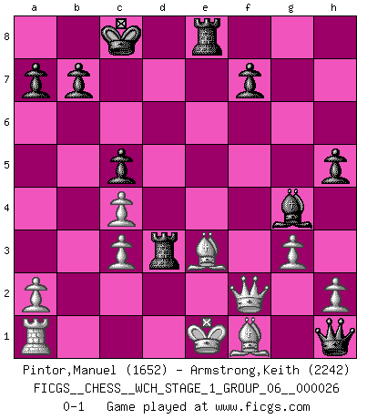 Last move : 0-1 2022 November 19 20:25:57 [Event "FICGS__CHESS__WCH_STAGE_1_GROUP_06__000026"] [Site "FICGS"] [Date "2022.11.02"] [Round "1"] [White "Pintor,Manuel"] [Black "Armstrong,Keith"] [Result "0-1"] [WhiteElo "1652"] [BlackElo "2242"] 1.e4 c5 2.f4 d5 3.exd5 Nf6 4.c4 e6 5.dxe6 Bxe6 6.Nf3 Nc6 7.Ne5 Nxe5 8.fxe5 Qd4 9.exf6 Qh4+ 10.g3 Qe4+ 11.Qe2 Qxh1 12.d3 O-O-O 13.fxg7 Bxg7 14.Be3 h5 15.Nc3 Bg4 16.Qc2 Bxc3+ 17.bxc3 Rhe8 18.Qf2 Rxd3 0-1 Follow this game move after move (download)A chess genius has died; a loss for humanity. (Viktor Kortchnoi, about Bobby Fischer's death) Meine Liebe ist Schach, Schach, Schach. Ich muss jeden Tag Schach spielen, deshalb fühle ich mich so stark. (Miguel Najdorf) No soy una persona materialista y por eso, no resiento la falta o pérdida del dinero. La ausencia de cosas mundanas carece de importancia. Ya que el Ajedrez es una forma en la que puedo ser tan materialista como yo desee sin tener la necesidad de vender mi alma. (Jamie Walter Adams) L'attaque fait le spectacle, la défense gagne les matchs. (Dicton footballistique) Luck never gives; it only lends. (Swedish proverb)