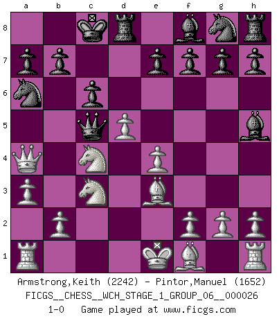 Last move : 1-0 2022 November 16 2:46:27 [Event "FICGS__CHESS__WCH_STAGE_1_GROUP_06__000026"] [Site "FICGS"] [Date "2022.11.02"] [Round "2"] [White "Armstrong,Keith"] [Black "Pintor,Manuel"] [Result "1-0"] [WhiteElo "2242"] [BlackElo "1652"] 1.Nf3 Nc6 2.d4 d5 3.c4 Bg4 4.cxd5 Qxd5 5.Nc3 Qa5 6.d5 Nb4 7.a3 Na6 8.Ne5 Bh5 9.Nc4 Qc5 10.Qa4+ c6 11.e4 O-O-O 12.Be3 1-0 Follow this game move after move (download)Fischer prefers to enter Chess history alone. (Miguel Najdorf) Am wohlsten fühle ich mich, wenn ich sehe, wie sich mein Gegner im Todeskampf windet. (Robert James Fischer) Los problemas de Ajedrez exigen del compositor las mismas virtudes que caracterizan todo el arte de valor: originalidad, invención, concisión, armonía, complejidad e insinceridad explendida. (Vladimir Nabokov) Une platitude souvent récitée à propos des Echecs est qu'une des choses les plus difficiles à réaliser est de gagner une position gagnante. Cela ne manque pas de sens mais, pour ma part, j'ai toujours trouvé plus difficile de gagner une position perdante. (Tim Krabbe) The only thing that overcomes hard luck is hard work. (Harry Golden)