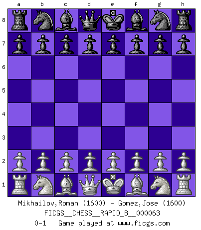 Last move : 0-1 2007 September 13 8:8:35 [Event "FICGS__CHESS__RAPID_B__000063"] [Site "FICGS"] [Date "2007.08.14"] [Round "1"] [White "Mikhailov,Roman"] [Black "Gomez,Jose"] [Result "0-1"] [WhiteElo "1600"] [BlackElo "1600"] 0-1 This chess game has been lost on time (started : 2007.08.14 6:51:31) Player Black won this chess game. Follow this game move after move (download)The game of chess is the touchstone of the intellect. (Goethe) Obwohl ich alt bin, darf mir niemand den Finger in den Mund stecken, sonst beisse ich. (Wilhelm Steinitz) El Ajedrez hace al hombre ser mas sabio y ver mas claro. (Vladimir Putin) L'attaque fait le spectacle, la défense gagne les matchs. (Dicton footballistique) Fortune favours the audacious. (Desiderius Erasmus)
