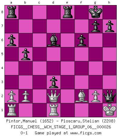Last move : 0-1 2022 December 27 11:41:59 [Event "FICGS__CHESS__WCH_STAGE_1_GROUP_06__000026"] [Site "FICGS"] [Date "2022.11.02"] [Round "2"] [White "Pintor,Manuel"] [Black "Ploscaru,Stelian"] [Result "0-1"] [WhiteElo "1652"] [BlackElo "2208"] 1.e4 c5 2.f4 d5 3.exd5 Nf6 4.c4 e6 5.Nc3 exd5 6.cxd5 Nxd5 7.Nxd5 Qxd5 8.Nf3 Be7 9.Qc2 Bf5 10.Qa4+ Nc6 11.Bc4 Qd6 12.d3 O-O 13.O-O a6 14.Qb3 b5 15.Bd5 Na5 16.Qa3 Qxd5 17.Qxa5 Bxd3 18.Rd1 Rfe8 19.Ne5 Qd4+ 20.Kh1 c4 21.Qe1 Bd6 22.Bd2 f6 23.Be3 Qe4 24.Nxd3 cxd3 25.Bf2 Qxf4 26.Qd2 Qxh2+ 0-1 Follow this game move after move (download)A man without frontiers. He didn't divide the East and the West, he brought them together in their admiration for him. (Ljubomir Ljubojevic, about Bobby Fischer's death) Privat ist Kortschnoi kein schlechter Mensch, sehr sympathisch. Aber während des Spiels ist er grausam. Er will dich töten. (Miguel Najdorf) El tablero es el mundo, las piezas es el fenomeno del universo, las reglas del juego son lo que llamamos leyes de la naturaleza y el jugador del lado opuesto, se encuentra oculto a nuestra vista. (Thomas Huxley) Les échecs, c'est l'art d'analyser. (Mikhail Botvinnik) Chess is everything: art, science and sport. (Anatoly Karpov)