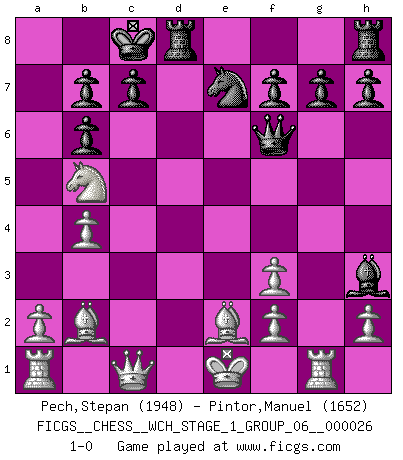 Last move : 1-0 2022 December 22 0:57:6 [Event "FICGS__CHESS__WCH_STAGE_1_GROUP_06__000026"] [Site "FICGS"] [Date "2022.11.02"] [Round "1"] [White "Pech,Stepan"] [Black "Pintor,Manuel"] [Result "1-0"] [WhiteElo "1948"] [BlackElo "1652"] 1.c4 e5 2.Nc3 Bc5 3.Nf3 Nc6 4.e3 d6 5.d4 exd4 6.exd4 Bb6 7.b4 Bg4 8.c5 dxc5 9.dxc5 Qf6 10.Bb2 Ne5 11.Be2 Nxf3+ 12.gxf3 Bh3 13.cxb6 axb6 14.Rg1 Ne7 15.Qc1 O-O-O 16.Nb5 1-0 Follow this game move after move (download)Robert Fischer is a law unto himself. (Larry Evans) Stil? Ich habe keinen Stil! (Anatoly Karpov) La mitad de las variaciones que son calculadas en una partida de torneo, resultan ser completamente superfluas. Desafortunadamente, nadie sabe por adelantado cual mitad. (Jan Tinman) La victoire dans une partie d'Echecs appartient la plupart du temps à celui qui voit un peu plus loin que l'adversaire. (Lasker) If you work for a living, why do you kill yourself working ? (Tuco to a chicken in The Good, The Bad and The Ugly)