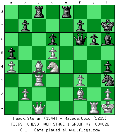 Last move : 0-1 2023 February 17 6:41:55 [Event "FICGS__CHESS__WCH_STAGE_1_GROUP_07__000026"] [Site "FICGS"] [Date "2022.11.02"] [Round "1"] [White "Haack,Stefan"] [Black "Maceda,Coco"] [Result "0-1"] [WhiteElo "1544"] [BlackElo "2235"] 1.e4 c5 2.Nf3 d6 3.d4 cxd4 4.Nxd4 Nf6 5.Nc3 a6 6.Be3 e5 7.Nb3 Be6 8.f3 h5 9.Nd5 Bxd5 10.exd5 Nbd7 11.Qd2 g6 12.c4 Bg7 13.Bd3 a5 14.a4 e4 15.Be2 O-O 16.O-O exf3 17.gxf3 Re8 18.Ra3 h4 19.Nd4 Rc8 20.Kh1 Qe7 21.Rg1 Nh5 22.Bf1 Qf6 23.Bf2 Ne5 24.Rc3 Rb8 25.Qc1 Ra8 26.Qd2 Rac8 27.Be2 Kh7 28.Qd1 Nf4 29.Bf1 Nxc4 30.Qc1 Bh6 31.Bxc4 Nh3 0-1 This chess game has been lost on time (started : 2022.11.02 13:52:6) Follow this game move after move (download)Chess, like any creative activity, can exist only through the combined efforts of those who have creative talent, and those who have the ability to organize their creative work. (Mikhail Botvinnik) Jeder Fehler erscheint unglaublich dumm, wenn andre ihn begehen. (Georg Christoph Lichtenberg) El Ajedrez es tan inspirador que yo no creo que un buen jugador sea capaz de tener un pensamiento malo durante una partida. (Wilhelm Steinitz) L'attaque fait le spectacle, la défense gagne les matchs. (Dicton footballistique) I've lost money so fast in these clubs it's left me reeling. I've read every poker book ever written, but the only way to get better at the game is to go out and play with people who are really good. The problem is, you stand to lose a lot of money doing it. (Matt Damon)