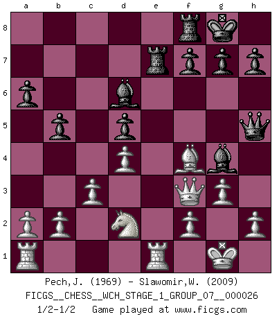 Last move : 1/2-1/2 2023 January 13 15:41:40 [Event "FICGS__CHESS__WCH_STAGE_1_GROUP_07__000026"] [Site "FICGS"] [Date "2022.11.02"] [Round "2"] [White "Pech,Jaroslav senior"] [Black "Slawomir,Weglicki"] [Result "1/2-1/2"] [WhiteElo "1969"] [BlackElo "2009"] 1.e4 e5 2.Nf3 Nc6 3.Bb5 a6 4.Ba4 Nf6 5.O-O Be7 6.Re1 b5 7.Bb3 O-O 8.c3 d5 9.exd5 Nxd5 10.Nxe5 Nxe5 11.Rxe5 c6 12.d4 Bd6 13.Re1 Qh4 14.g3 Qh3 15.Be3 Ra7 16.Qf3 Bg4 17.Qg2 Qh5 18.Nd2 Re7 19.Bxd5 cxd5 20.Bf4 Bh3 21.Qf3 Bg4 22.Qg2 Bh3 23.Qf3 Bg4 1/2-1/2 Follow this game move after move (download)The laws of Chess do not permit a free choice: you have to move whether you like it or not. (Emanuel Lasker) Karpov ist ein Museumsstück. (Garry Kasparov) Solo el jugador con la iniciativa tiene el derecho a atacar. (Wilhelm Steinitz) Les Echecs ne sont pas pour les âmes timides. Ils requièrent un homme entier, qui ne s'arrête pas aveuglément à ce qui a été déjà établi, mais qui tente individuellement de sonder les profondeurs du jeu. (W. Steinitz) Life is pleasant. Death is peaceful. It's the transition that's troublesome. (Isaac Asimov)