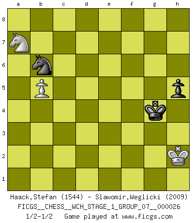 Last move : 1/2-1/2 2023 February 10 22:13:50 [Event "FICGS__CHESS__WCH_STAGE_1_GROUP_07__000026"] [Site "FICGS"] [Date "2022.11.02"] [Round "1"] [White "Haack,Stefan"] [Black "Slawomir,Weglicki"] [Result "1/2-1/2"] [WhiteElo "1544"] [BlackElo "2009"] 1.e4 e5 2.Nf3 Nc6 3.c3 d5 4.Qa4 Bd7 5.exd5 Nd4 6.Qd1 Nxf3+ 7.Qxf3 Nf6 8.Bc4 e4 9.Qe2 Bd6 10.d4 O-O 11.h3 b5 12.Bxb5 Bxb5 13.Qxb5 Rb8 14.Qc4 Re8 15.b4 Nh5 16.O-O f5 17.Qe2 Qh4 18.Na3 Re7 19.Nc4 g5 20.Bd2 Rf8 21.Ne5 Rg7 22.Kh1 g4 23.Rg1 f4 24.Qxe4 Qxf2 25.Qe1 Qg3 26.Qxg3 Nxg3+ 27.Kh2 Ne4 28.Be1 f3 29.gxf3 gxf3 30.Rxg7+ Kxg7 31.Bg3 Nxc3 32.Nd3 Kg6 33.Rf1 Ne2 34.Be5 Kg5 35.Ne1 Nxd4 36.Bxd6 cxd6 37.Kg3 Ne2+ 38.Kh2 Nd4 39.Kg3 Ne2+ 40.Kh2 f2 41.Nd3 Nc3 42.Nxf2 Kh4 43.Kg1 h5 44.Re1 Nxa2 45.Kg2 Nc3 46.Ne4 Nxd5 47.Nxd6 Nf4+ 48.Kh2 Nxh3 49.Re4+ Rf4 50.Rxf4+ Nxf4 51.b5 Kg4 52.Nc8 Nd5 53.Nxa7 Nb6 1/2-1/2 Follow this game move after move (download)It is always better to sacrifice your opponent's men. (Savielly Tartakower) Ich war zu klein für die Schach-Schülermannschaft! (Woody Allen) Yo creo que el Ajedrez posee una magia que es también una ayuda en la edad avanzada. Una rodilla reumática es olvidada durante una partida de Ajedrez y otros eventos pueden parecer algo sin importancia comparada a una catástrofe en el tablero de Ajedrez. (Vlastimil Hort) On n'a jamais que l'âge auquel on a commence à jouer aux échecs car après on cesse de vieillir. (Capablanca) Perseverance does not equal worthiness. Next time you want to get my attention, wear something fun. Low-riding jeans are hot. (Gregory House, House M.D.)