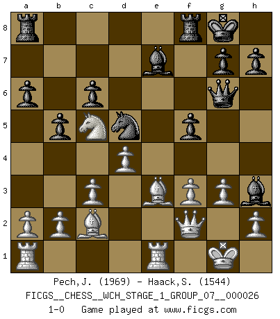 Last move : 1-0 2023 February 25 16:0:0 [Event "FICGS__CHESS__WCH_STAGE_1_GROUP_07__000026"] [Site "FICGS"] [Date "2022.11.02"] [Round "1"] [White "Pech,Jaroslav senior"] [Black "Haack,Stefan"] [Result "1-0"] [WhiteElo "1969"] [BlackElo "1544"] 1.e4 e5 2.Nf3 Nc6 3.Bb5 a6 4.Ba4 b5 5.Bb3 Nf6 6.O-O Be7 7.Re1 O-O 8.c3 d5 9.exd5 Nxd5 10.Nxe5 Nxe5 11.Rxe5 c6 12.d4 Bd6 13.Re1 Qh4 14.g3 Qh3 15.Be3 Bg4 16.Qd3 Bf3 17.Qf1 Qh5 18.Nd2 Bg4 19.f3 Bh3 20.Qf2 Qg6 21.Ne4 Be7 22.Bc2 f5 23.Nc5 1-0 This chess game has been lost on time (started : 2022.11.02 13:52:6) Follow this game move after move (download)When you don't know what to do, wait for your opponent to get an idea - it's sure to be wrong. (Tarrasch) Rauchen ist dem Schachspieler bei seiner Arbeit, also im Wettkampf, untersagt. (Viktor Kortschnoi) Fischer es el jugador mas fuerte del mundo. De hecho, el jugador mas fuerte que jamas haya existido. (Larry Evans) Karpov est une pièce de musée. (Garry Kasparov) Wipe them out. All of them. (Darth Sidious in Star Wars ep.1)