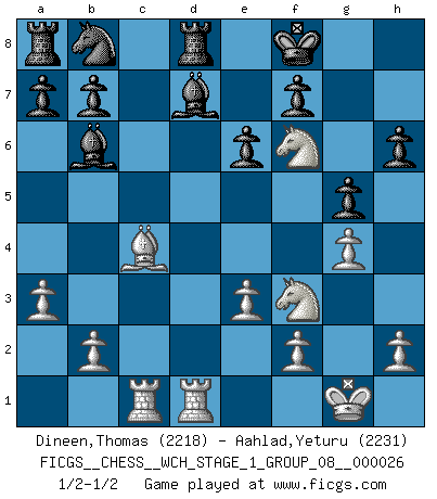 Last move : 1/2-1/2 2022 December 16 20:58:3 [Event "FICGS__CHESS__WCH_STAGE_1_GROUP_08__000026"] [Site "FICGS"] [Date "2022.11.02"] [Round "2"] [White "Dineen,Thomas"] [Black "Aahlad,Yeturu"] [Result "1/2-1/2"] [WhiteElo "2218"] [BlackElo "2231"] 1.d4 Nf6 2.c4 e6 3.Nf3 d5 4.Nc3 Bb4 5.Bg5 h6 6.Bxf6 Qxf6 7.e3 O-O 8.Rc1 dxc4 9.Bxc4 c5 10.O-O cxd4 11.Ne4 Qe7 12.a3 Ba5 13.Qxd4 Rd8 14.Qe5 Bb6 15.Rfd1 Bd7 16.Qd6 Kf8 17.Qf4 Nc6 18.g4 g5 19.Qf6 Qxf6 20.Nxf6 Nb8 1/2-1/2 Follow this game move after move (download)When asked, -How is that you pick better moves than your opponents?, I responded: I'm very glad you asked me that, because, as it happens, there is a very simple answer. I think up my own moves, and I make my opponent think up his. (Alexander Alekhine) Wenn Dein Gegner dir ein Remis anbietet, versuch herauszufinden, weshalb er glaubt schlechter zu stehen. (Nigel Short) Al jugar al Ajedrez entonces, podemos aprender: Primero: Previsión... Segundo: Prudencia... Tercero: Cautela... Y al final, aprendemos del Ajedrez el hábito de no ser desanimados por apariencias malas presentes en el estado de nuestros asuntos, el hábito de la esperanza por una oportunidad favorable y la perseveración de los secretos de los recursos. (Benjamin Franklin) Le joueur d'Echecs qui veut atteindre le top est obligé de développer son propre credo créatif. Alexeï Stepanovicth Souétine. Il est facile d'écrire des livres ! Ce qui est difficile, c'est de jouer ! (Alexeï Stepanovicth Souétine) Experiences are the keys to life. (Daniel Parmet)