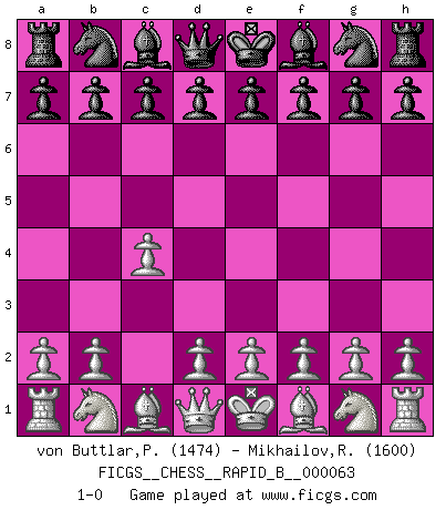 Last move : 1-0 2007 September 13 14:9:33 [Event "FICGS__CHESS__RAPID_B__000063"] [Site "FICGS"] [Date "2007.08.14"] [Round "1"] [White "von Buttlar,Paul"] [Black "Mikhailov,Roman"] [Result "1-0"] [WhiteElo "1474"] [BlackElo "1600"] 1.c4 1-0 This chess game has been lost on time (started : 2007.08.14 6:51:31) English Opening Player White won this chess game. Follow this game move after move (download)All Chess players should have a hobby. (Savielly Tartakower) Gewöhnliche Menschen denken nur daran, wie sie ihre Zeit verbringen. Ein intelligenter Mensch versucht, sie auszunutzen. (Arthur Schopenhauer) Por tratar de evitar la pérdida de una pieza, muchas personas han perdido una partida de Ajedrez. (Savielly Tartakover) Votre seul travail dans les ouvertures est d'obtenir un milieu de partie jouable. (Lajos Portish) The absolute truth is the thing that makes people laugh. (Carl Reiner)