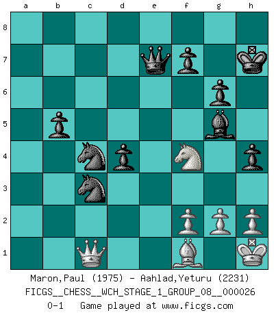 Last move : 0-1 2023 January 29 17:48:45 [Event "FICGS__CHESS__WCH_STAGE_1_GROUP_08__000026"] [Site "FICGS"] [Date "2022.11.02"] [Round "2"] [White "Maron,Paul"] [Black "Aahlad,Yeturu"] [Result "0-1"] [WhiteElo "1975"] [BlackElo "2231"] 1.d4 Nf6 2.Nf3 d5 3.e3 e6 4.Bd3 Be7 5.O-O O-O 6.Nbd2 c5 7.dxc5 a5 8.e4 Nbd7 9.exd5 exd5 10.Re1 Nxc5 11.Nf1 a4 12.c3 Nfe4 13.Be3 a3 14.b4 Na4 15.Qb3 Bf6 16.Nd4 Nexc3 17.Ng3 Qb6 18.Ngf5 Bxf5 19.Nxf5 d4 20.Bc1 h5 21.Bxa3 g6 22.Ng3 h4 23.Ne2 Kg7 24.Nf4 Rfe8 25.Rxe8 Rxe8 26.Rf1 Qc7 27.Nh3 b5 28.Bc1 Nb6 29.a3 Nc4 30.Kh1 Qc6 31.Bf4 Ra8 32.Ra1 Qe6 33.Qc2 Rxa3 34.Qc1 Rxa1 35.Qxa1 Qe7 36.Qc1 Qxb4 37.Bh6+ Kg8 38.Bf1 Qe7 39.Nf4 Kh7 40.Bg5 Bxg5 0-1 Follow this game move after move (download)In the perfect Chess combination as in a first-rate short story, the whole plot and counter-plot should lead up to a striking finale, the interest not being allayed until the very last moment. (Yates and Winter) Es ist nicht das erste mal, dass sich die FIDE dem Arabischen Geld gebeugt hat (über die FIDE WM 2004 in Lybien). (Larry Evans) No existe un remordimiento como el remordimiento del Ajedrez. (H. G. Wells) Les ravages du H expliquent la différence de niveau entre Tal et Thal [Abergel]. The only thing that matters is the evidence. (Horatio Caine, C.S.I. Miami)
